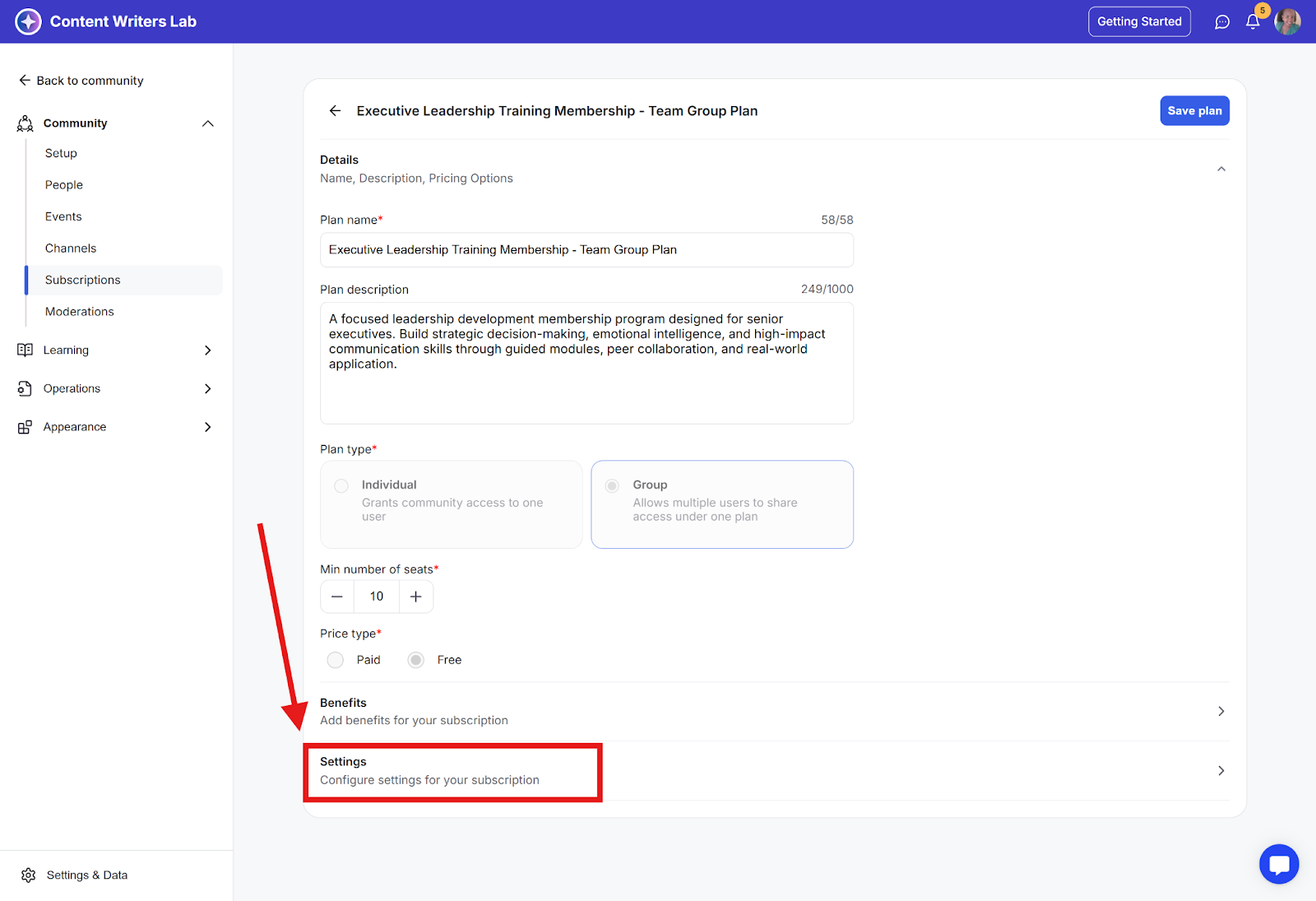 Step 2: Click on the plan you want to configure or create a new one. After setting up your plan details, scroll down to Settings.