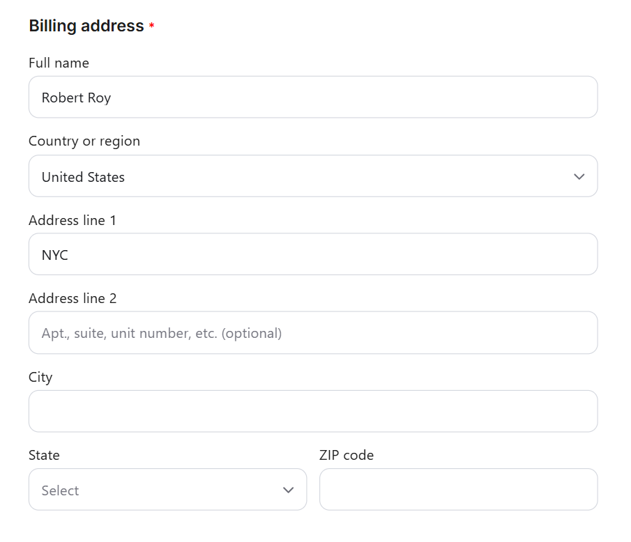 Here’s what the checkout page experience looks like for your customers when billing address collection is enabled.