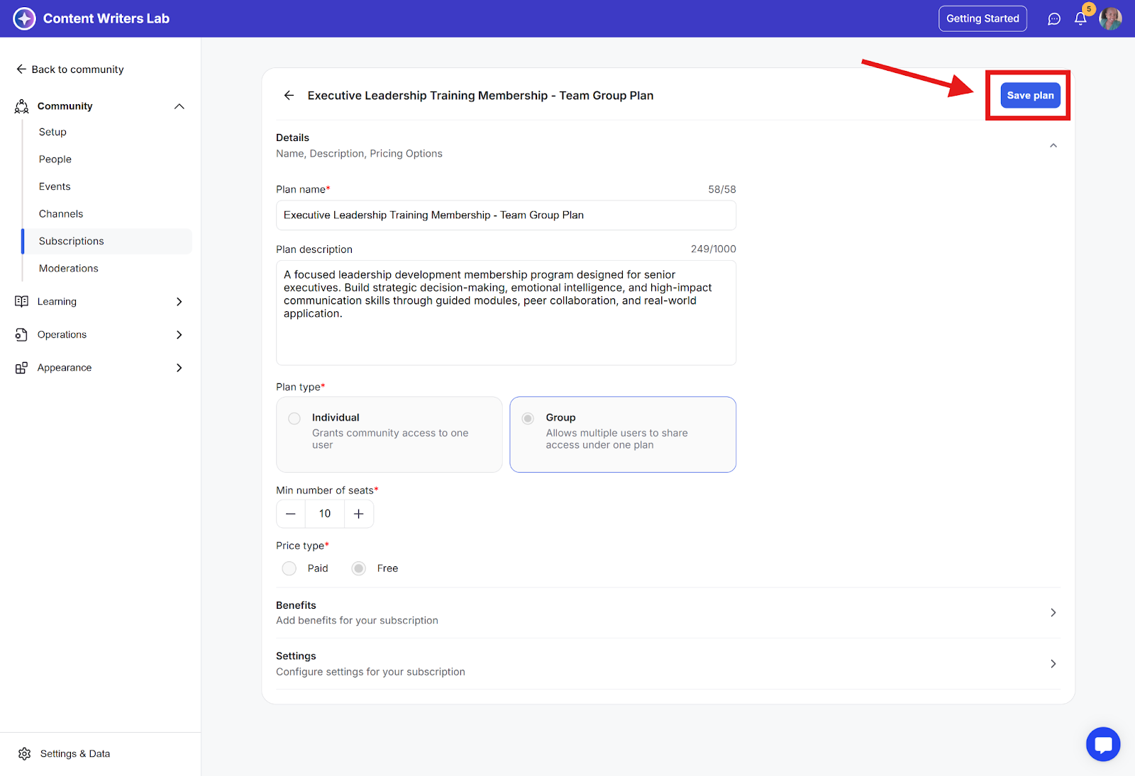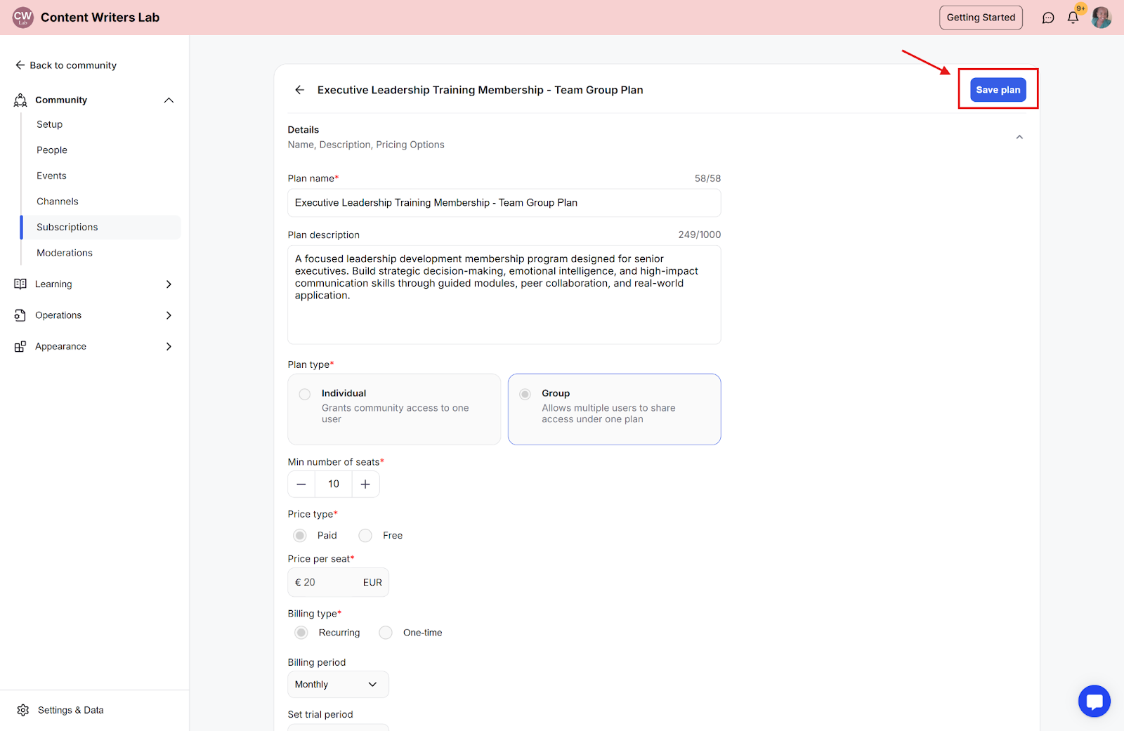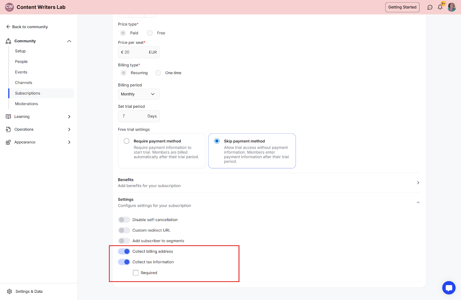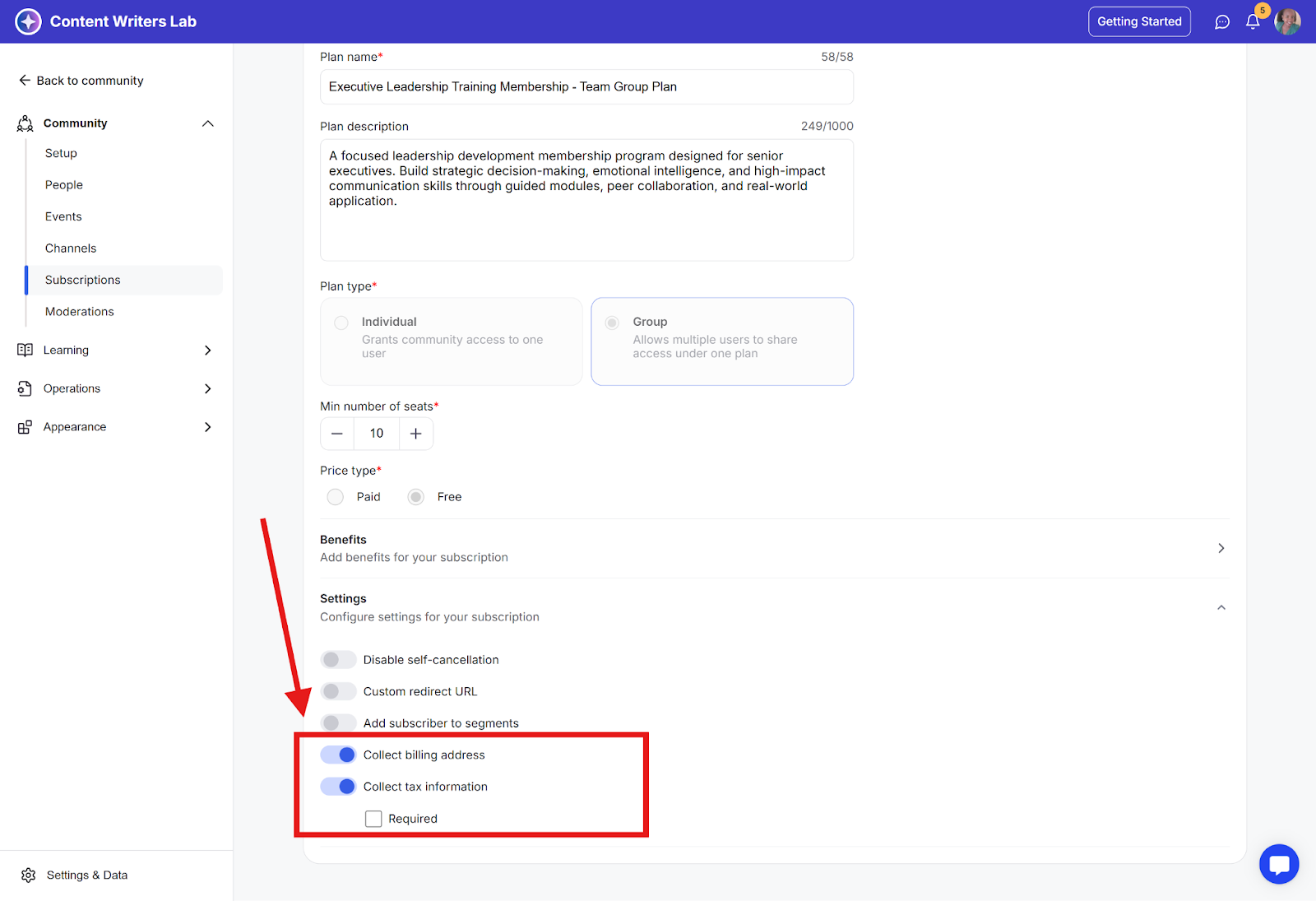 Step 4: Once enabled, click Save Plan. The checkout page for that plan will now include fields to collect both billing and tax details. You can enable both options for courses, library content, and events in the pricing tabs.