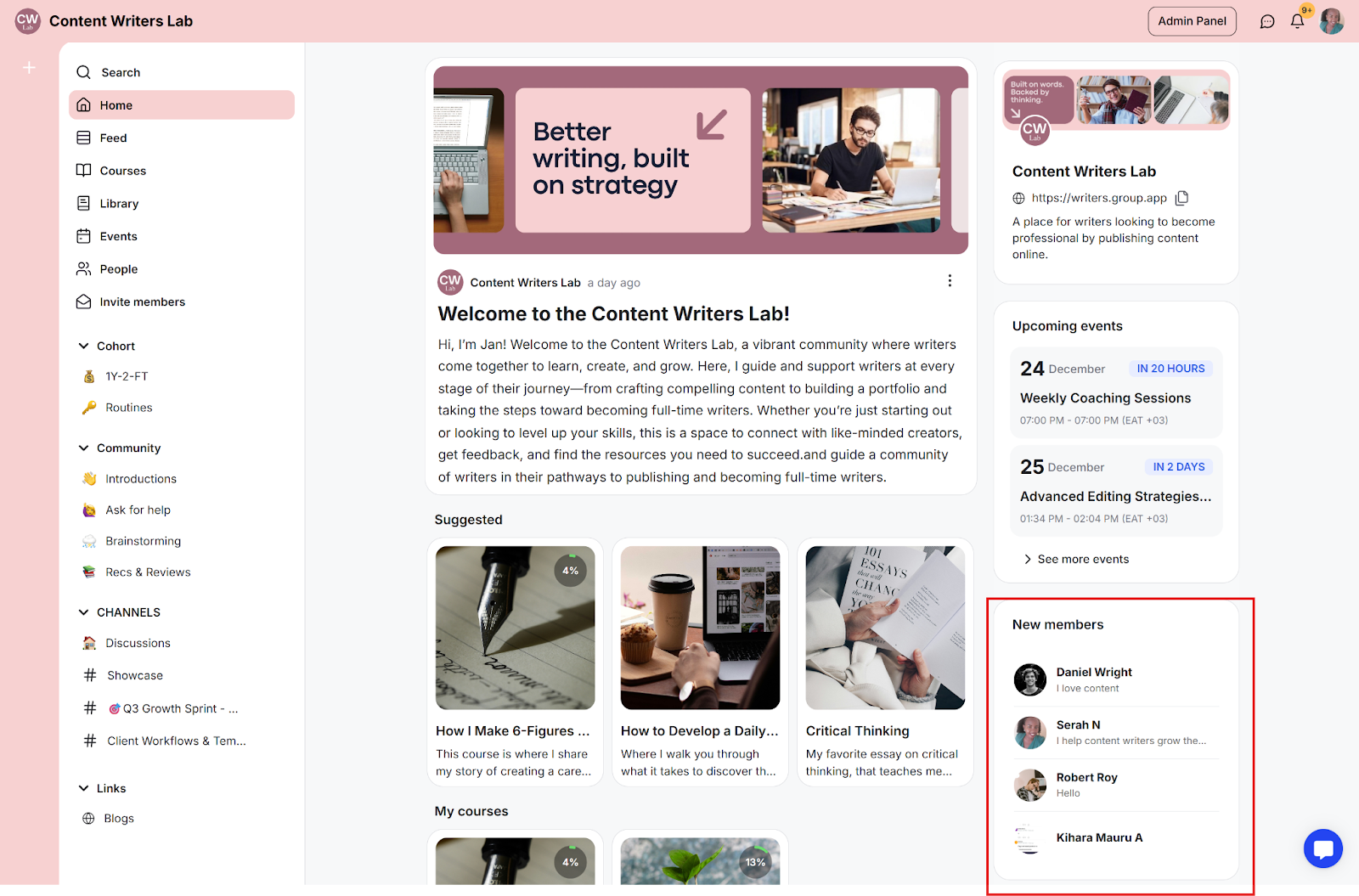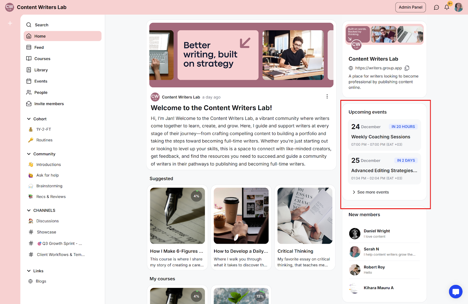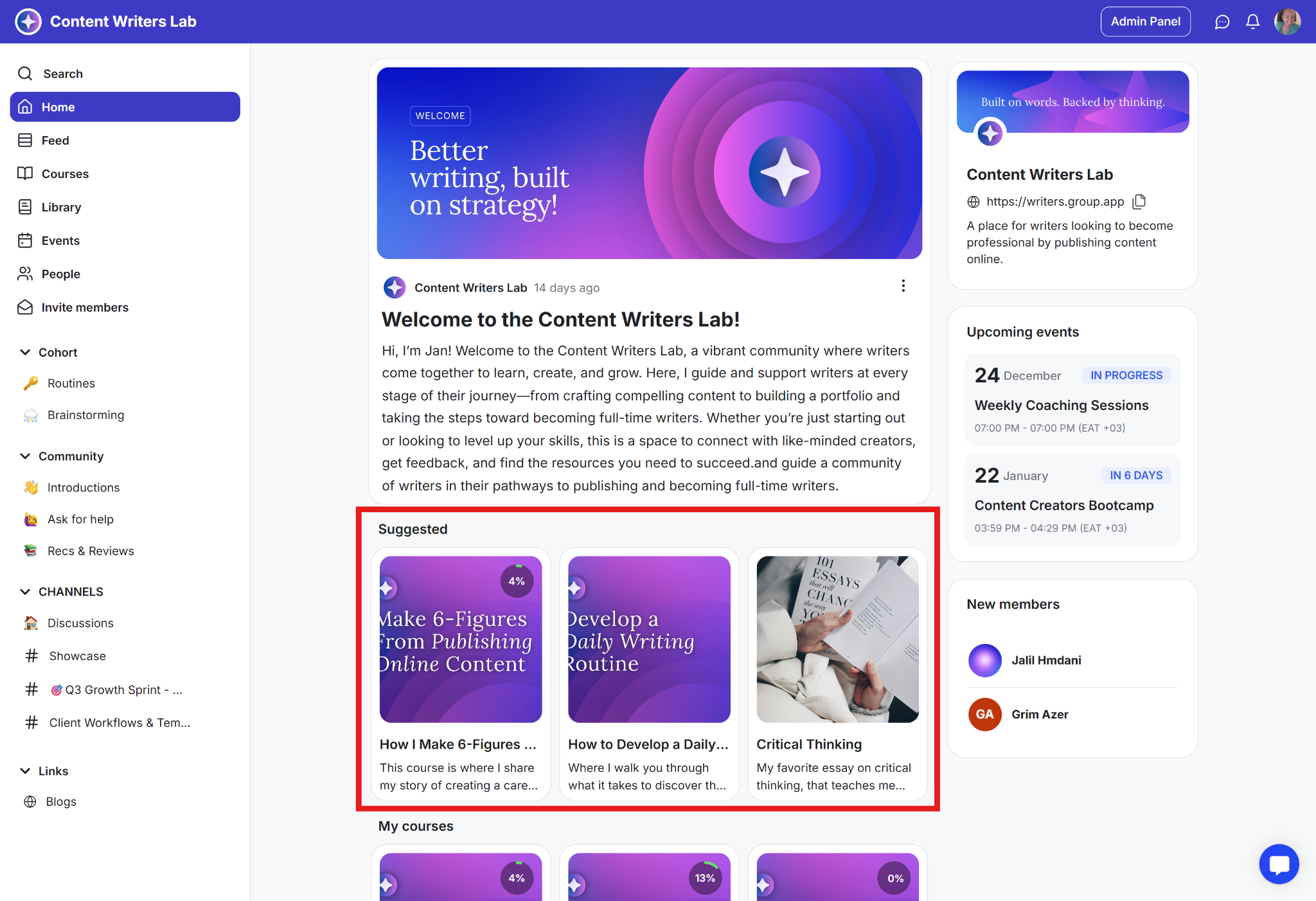 The home page displays critical information and elements relevant to the specific member. This includes suggested courses, upcoming events, and channels they have joined. You can also display the new members tab.