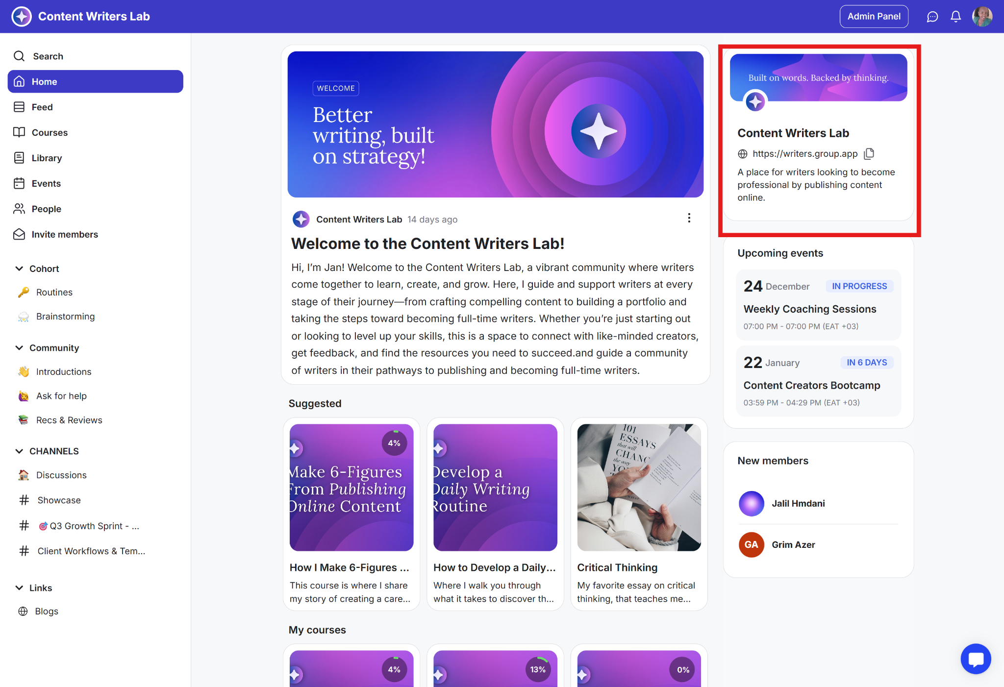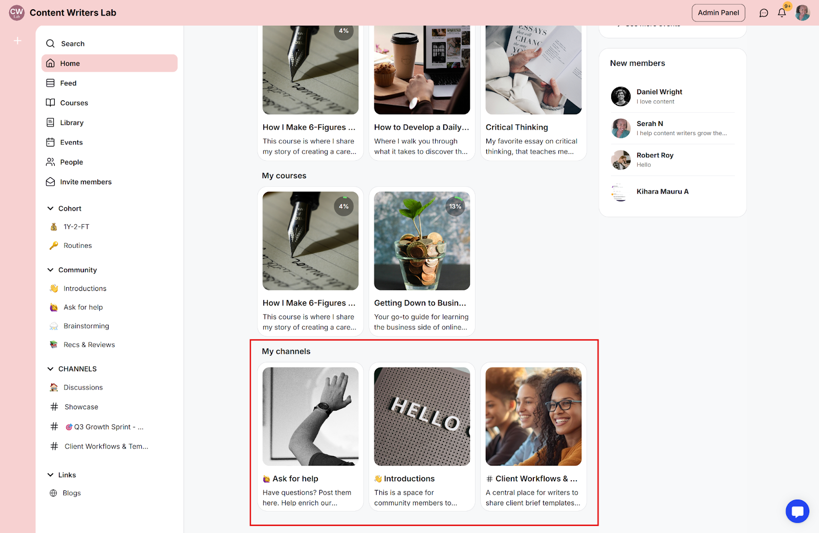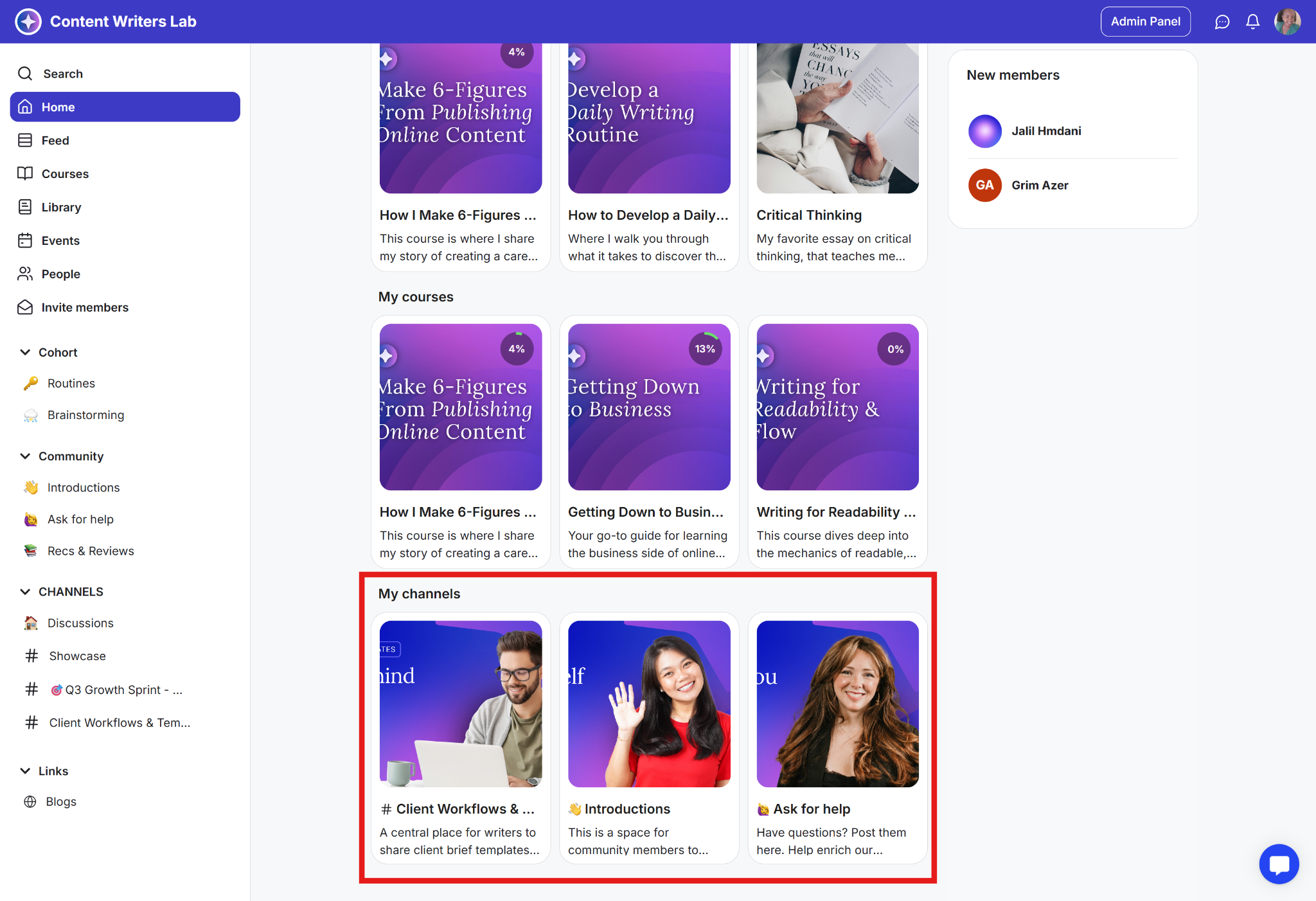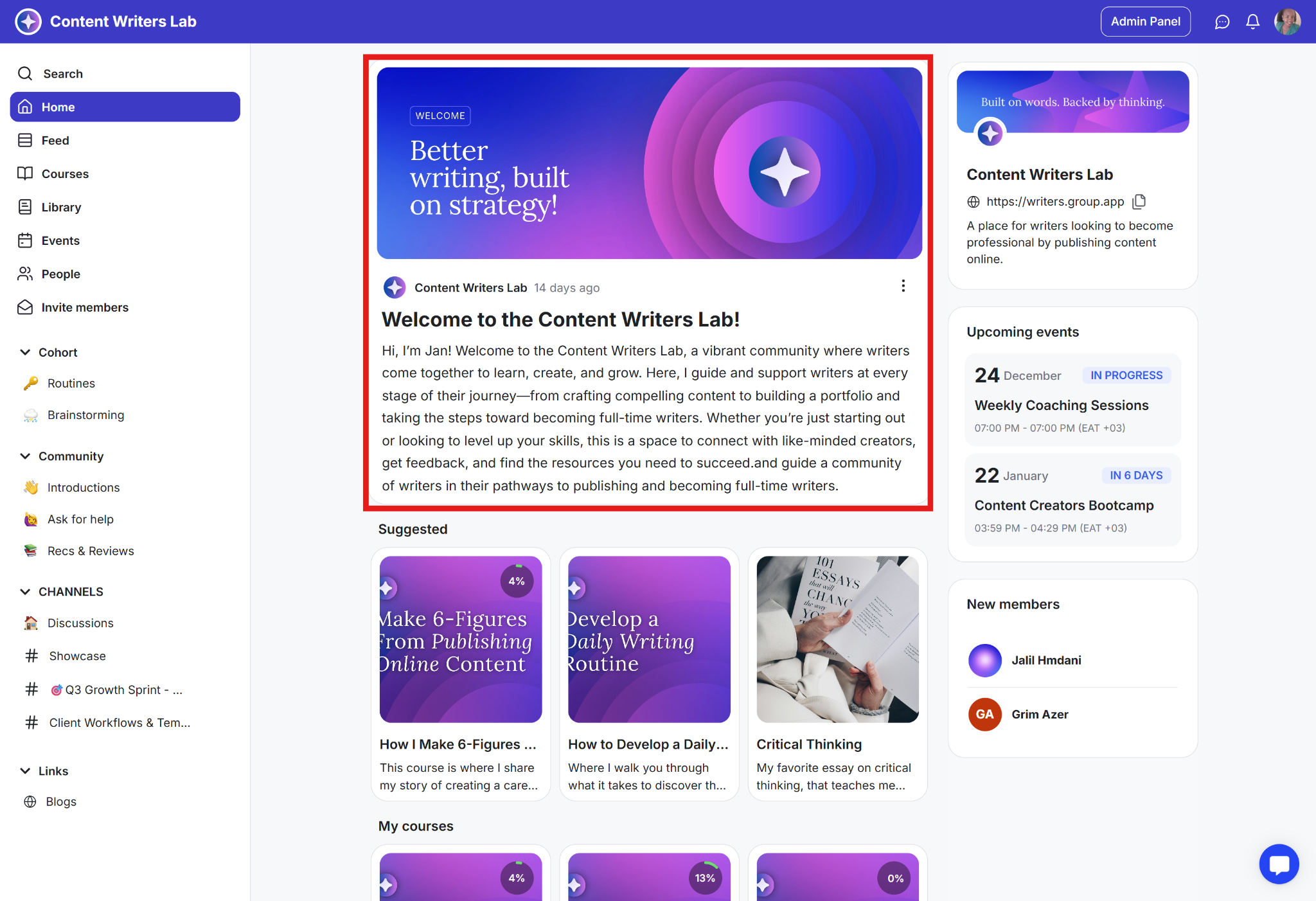 The home page displays critical information and elements relevant to the specific member. This includes suggested courses, upcoming events, and channels they have joined. You can also display the new members tab.