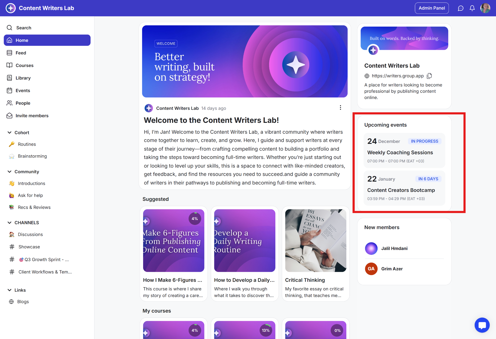 Program flow: Suggested content shows new courses, while Upcoming Events lists the cohort calls. Members always know what’s next.