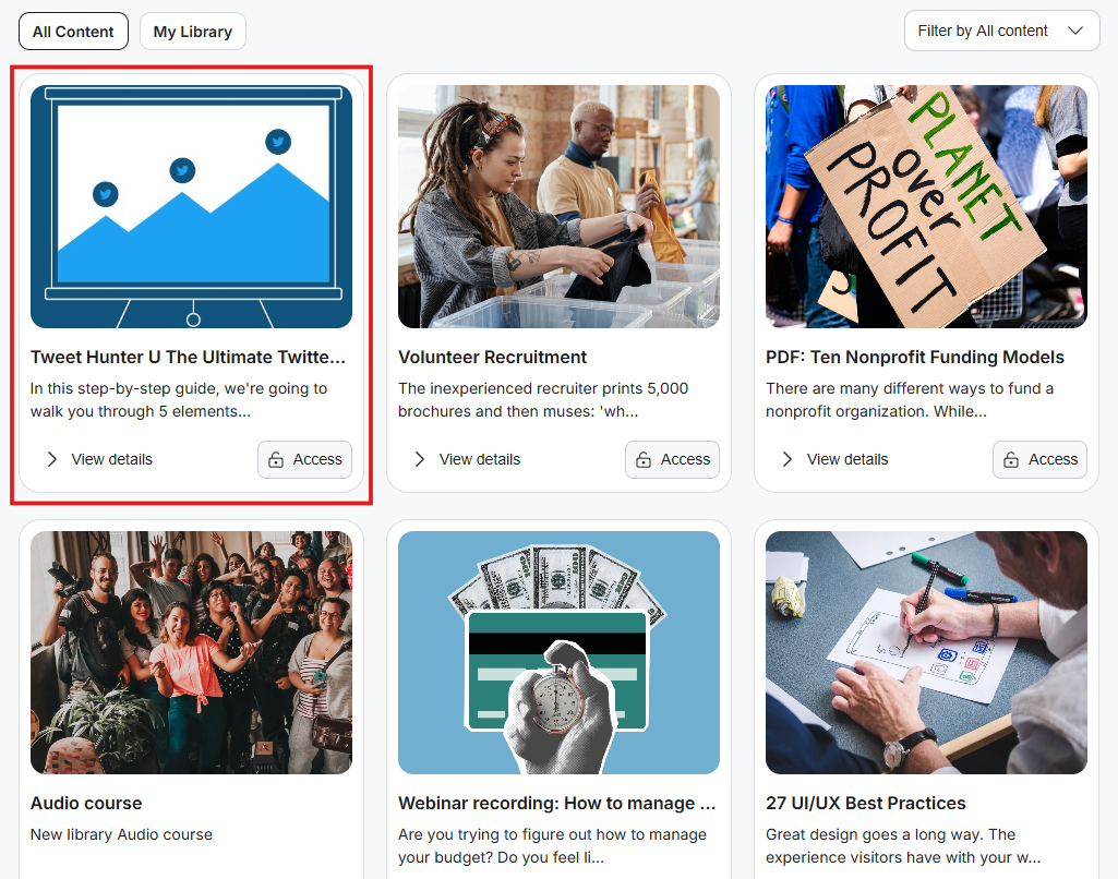 What it is: Each resource appears as a content card showing its title, thumbnail, and an Access button.
