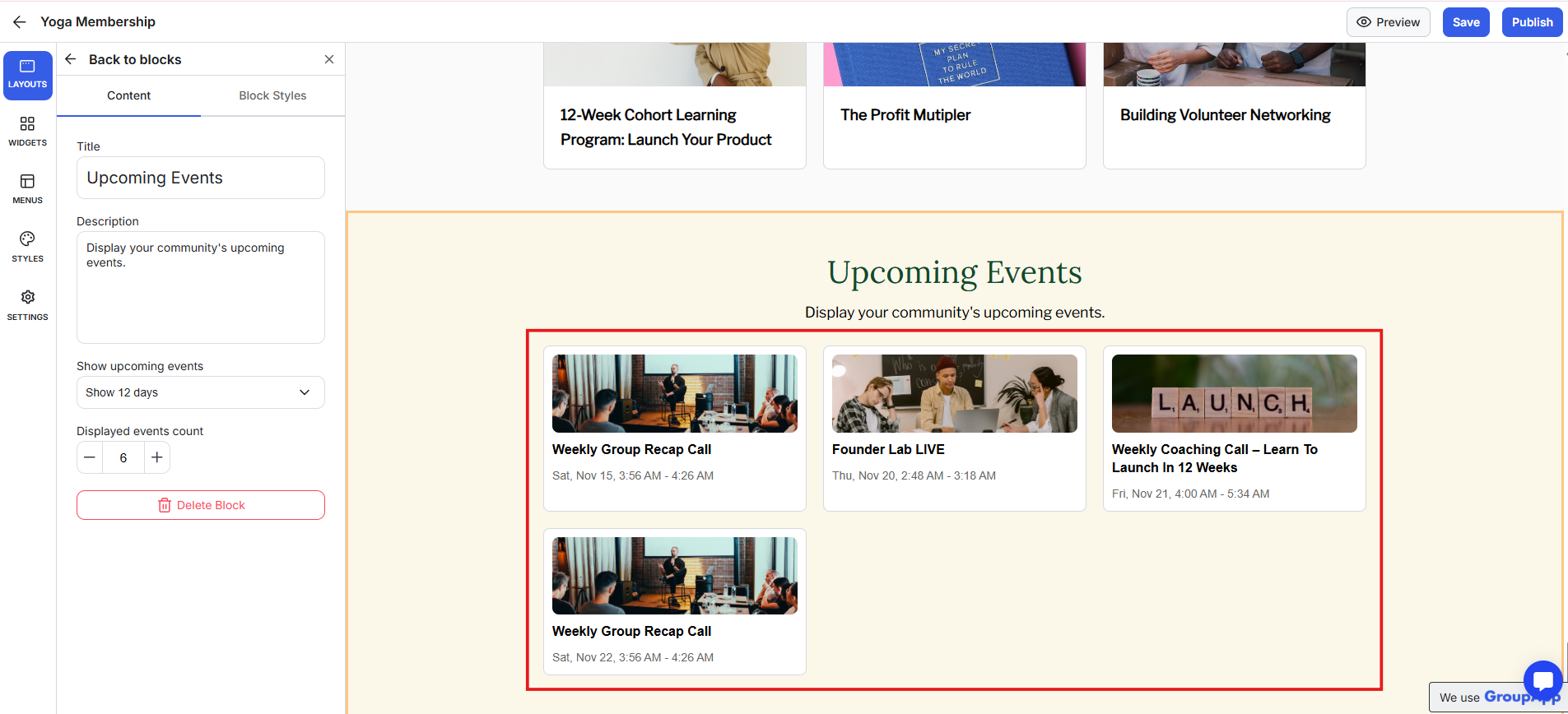 What it’s useful for: Keeps your calendar of live sessions and workshops visible to both members and visitors. It automatically displays published, public events scheduled for future dates.
