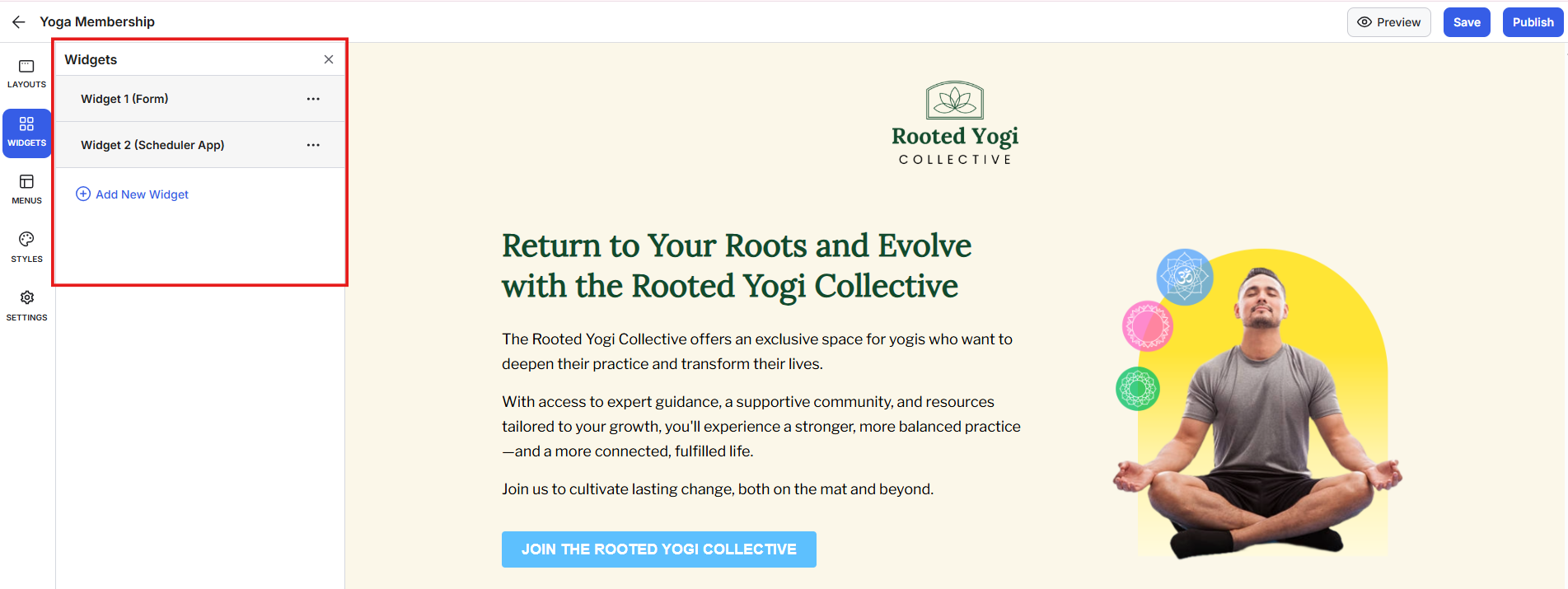 Widgets can include lead-capture forms, Calendly scheduling links, or custom HTML embeds such as Typeform or Google Forms. They appear as pop-ups triggered by buttons, letting visitors sign up or interact without leaving your page.