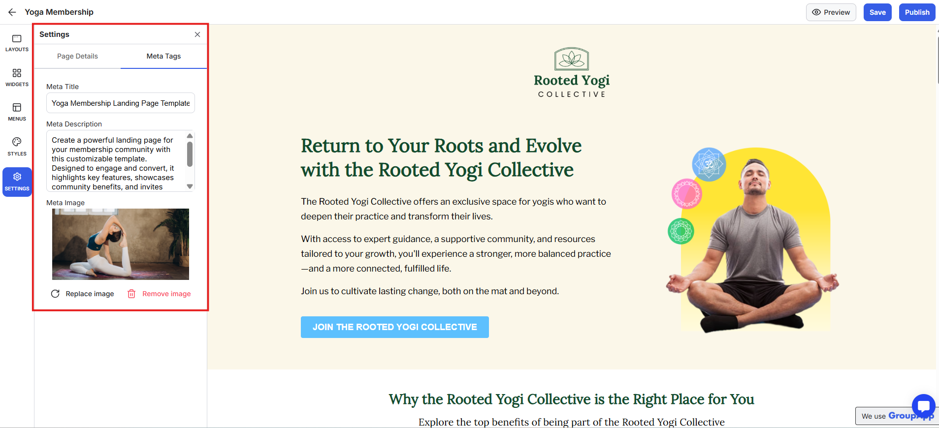 What it is: The place where you manage your page title, meta description, meta image, URL, and SEO details to improve visibility when your page is shared or indexed.