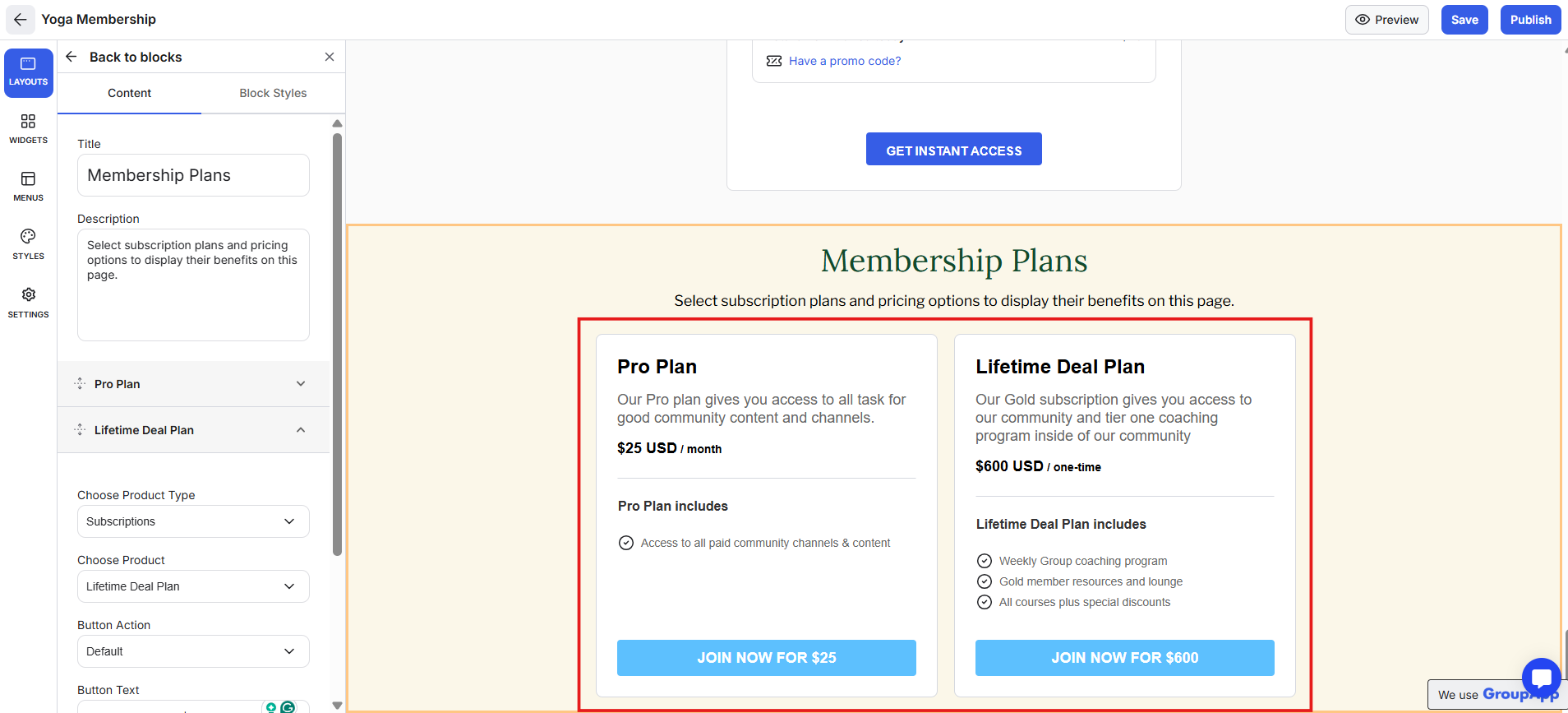Membership offers: Display multiple pricing tiers with the Plans Block so visitors can compare benefits and sign up for the right level.