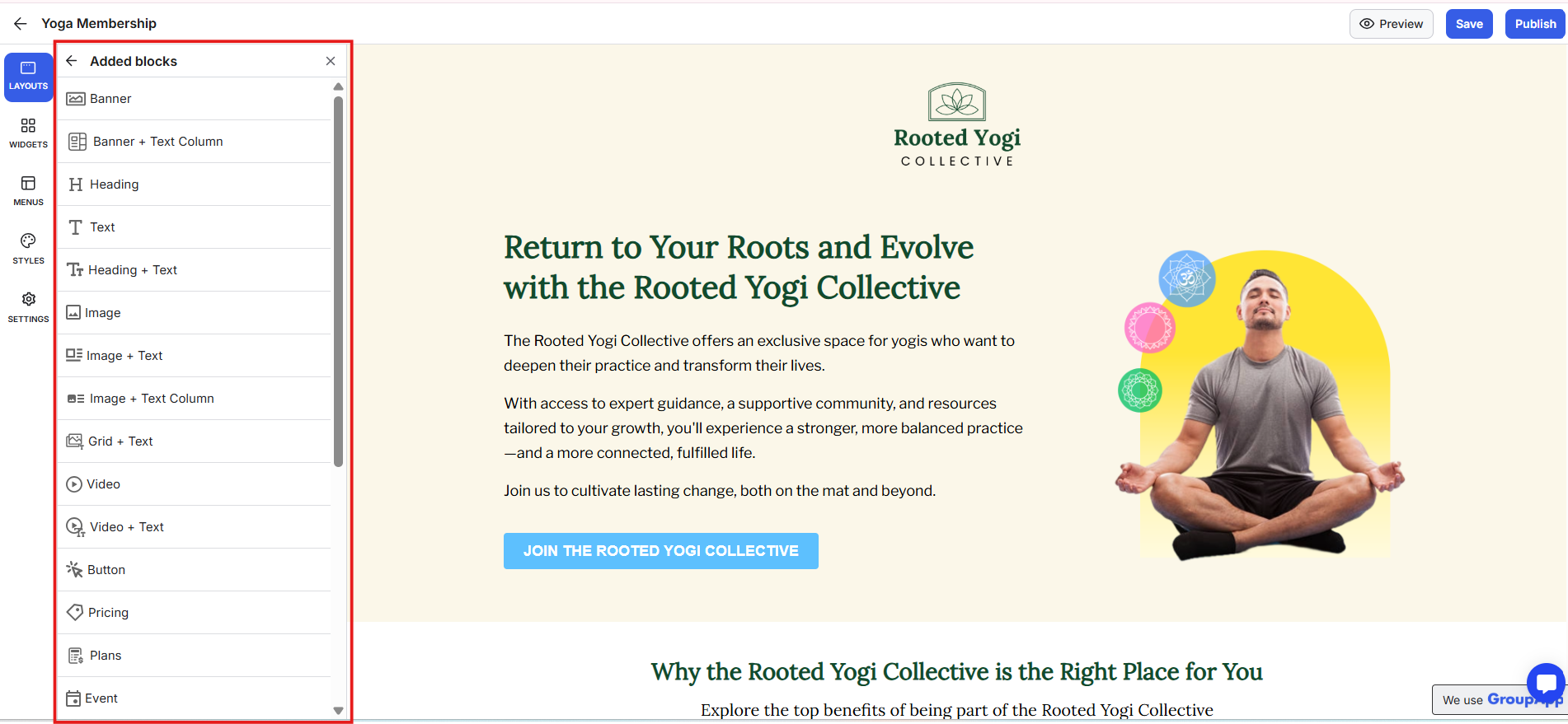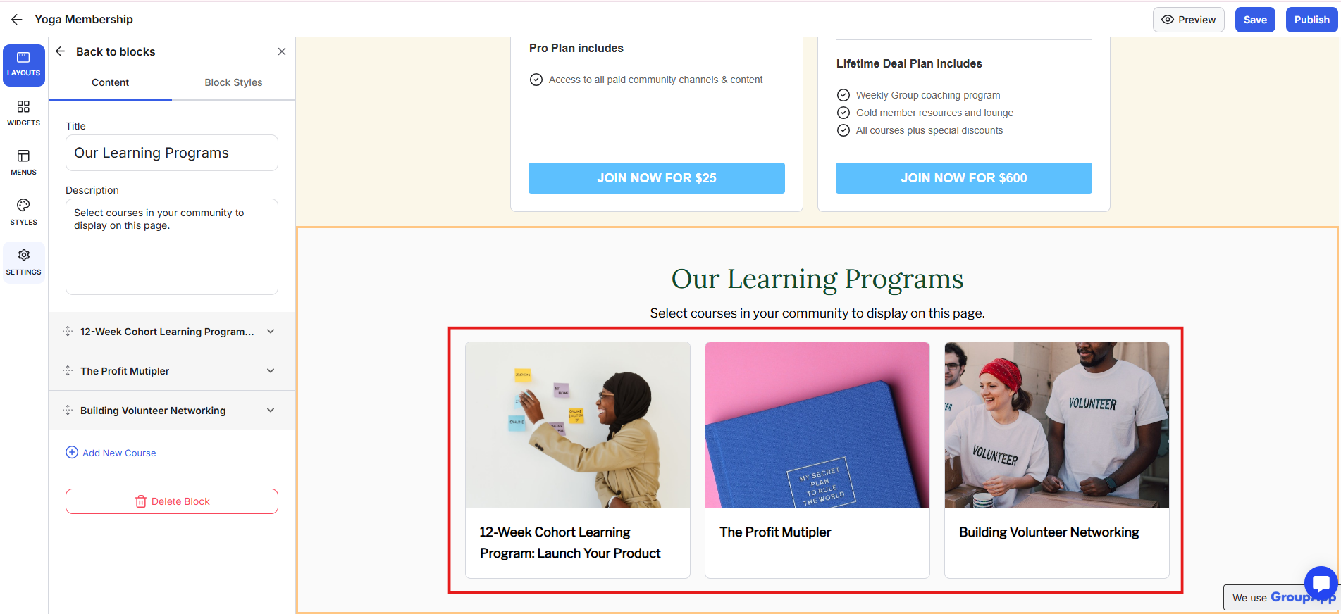 The Landing Page Builder lets you design professional, conversion-ready pages for your community. You can promote courses, events, memberships, workshops, and digital products - all within GroupApp.