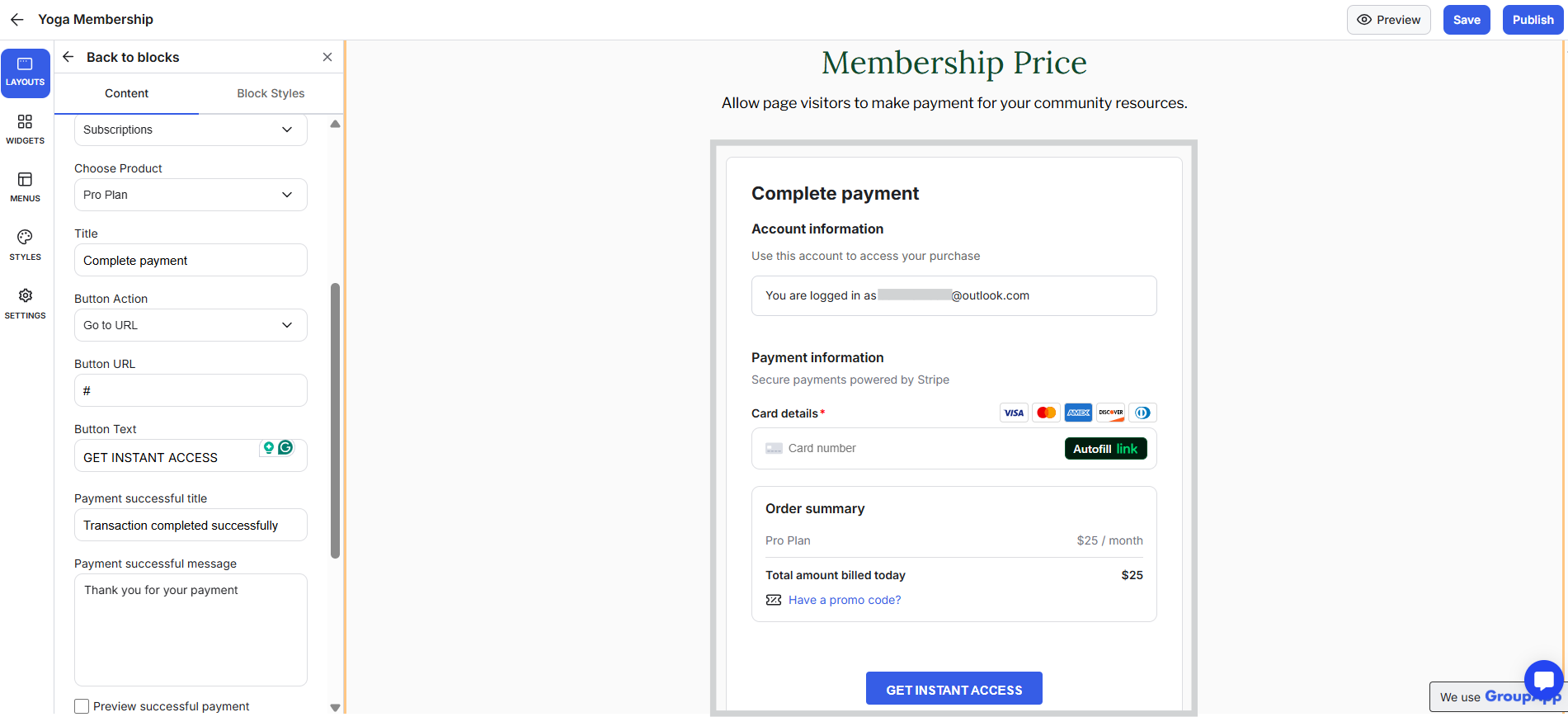 What it’s useful for: Turns your landing page into a complete, self-contained checkout flow. You can also create an upsell payment block that appears after a purchase, for example, offering a premium course or an annual plan upgrade.