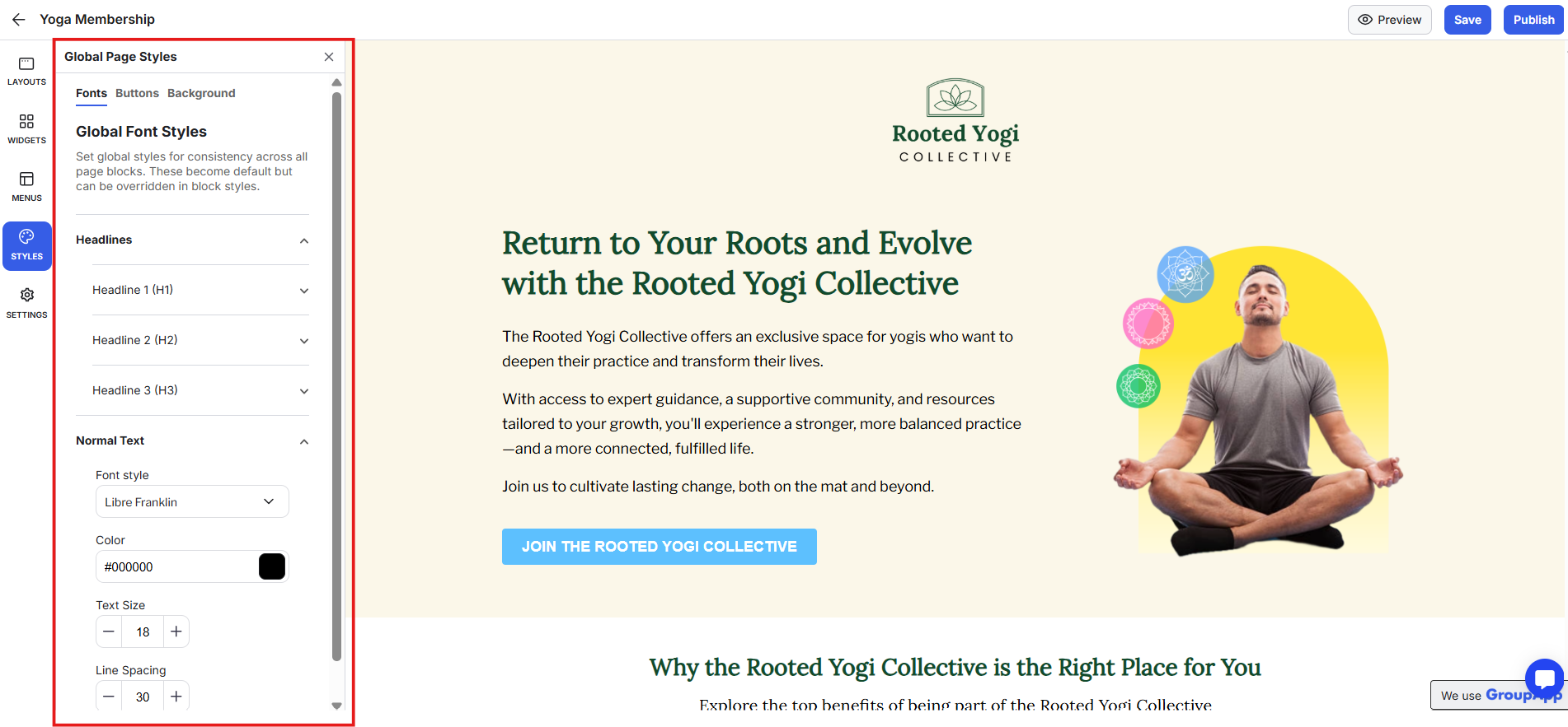 Global styles save time, keep your look cohesive, and ensure every landing page element/block feels like part of the same brand.