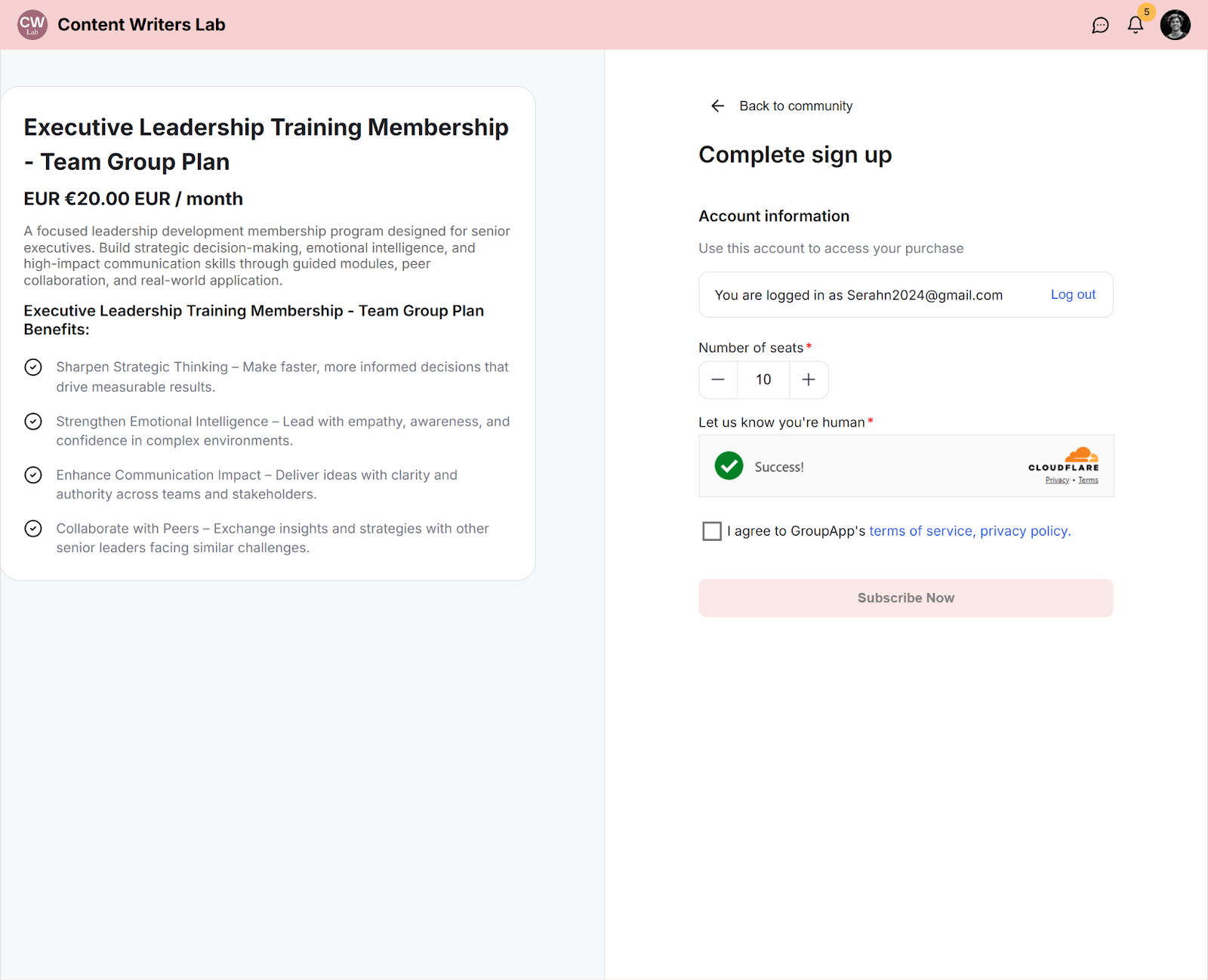 Step 4: When you share this link with an invited or existing community member, they will be taken to the checkout page for that subscription, where they can sign up or upgrade.