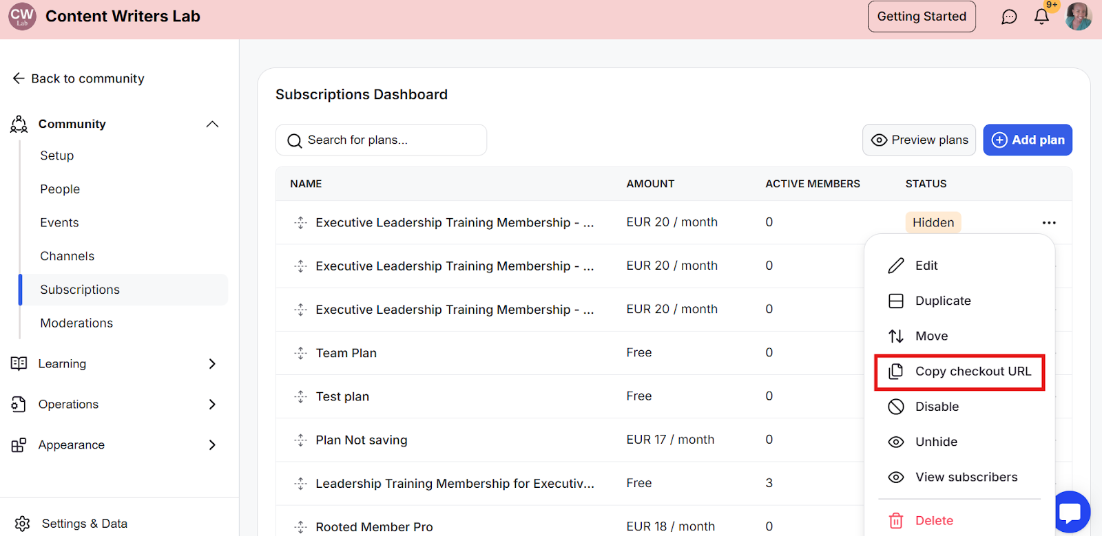 Step 3: Find the hidden subscription plan you want to share and click the three-dot icon. Then, select Copy Checkout URL from the drop-down menu. This will copy the checkout URL for that specific plan to your clipboard.