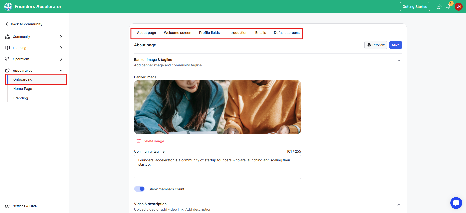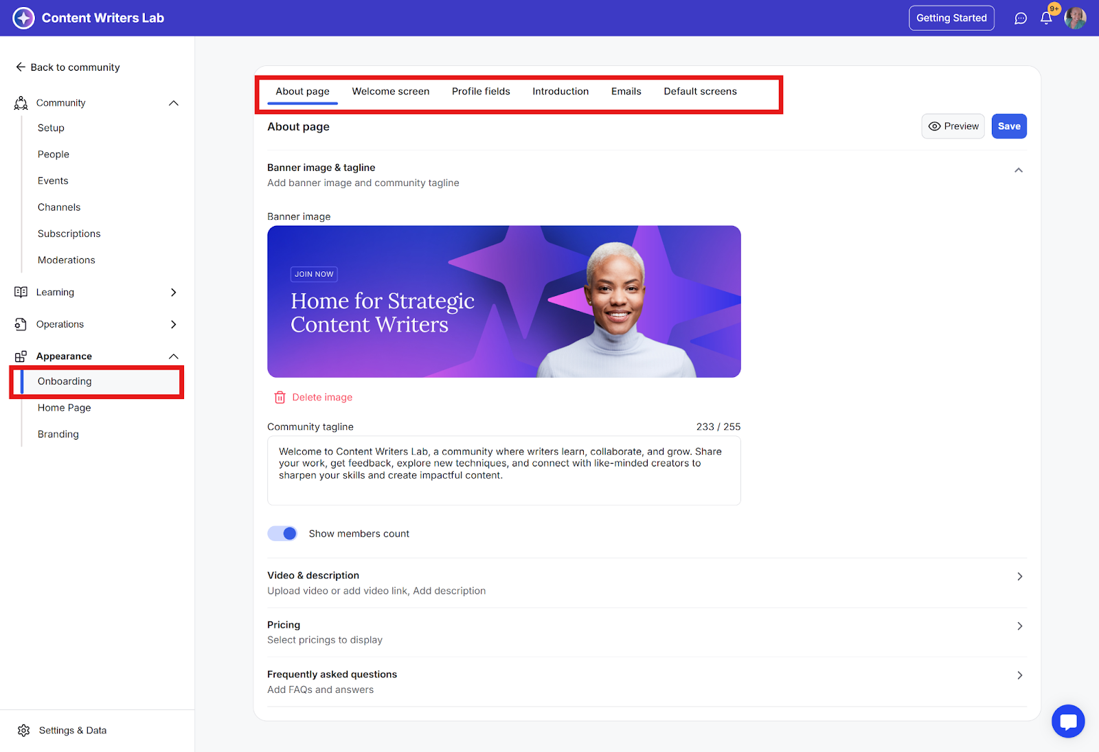 Onboarding creates a personalized first-time experience for every member and visitor. It brings six components together: About Page, Welcome Screen, Custom Profile Fields, Introductions, Onboarding Emails, and Default Pages, so you can greet people, collect the right info, and guide them to a clear next step.