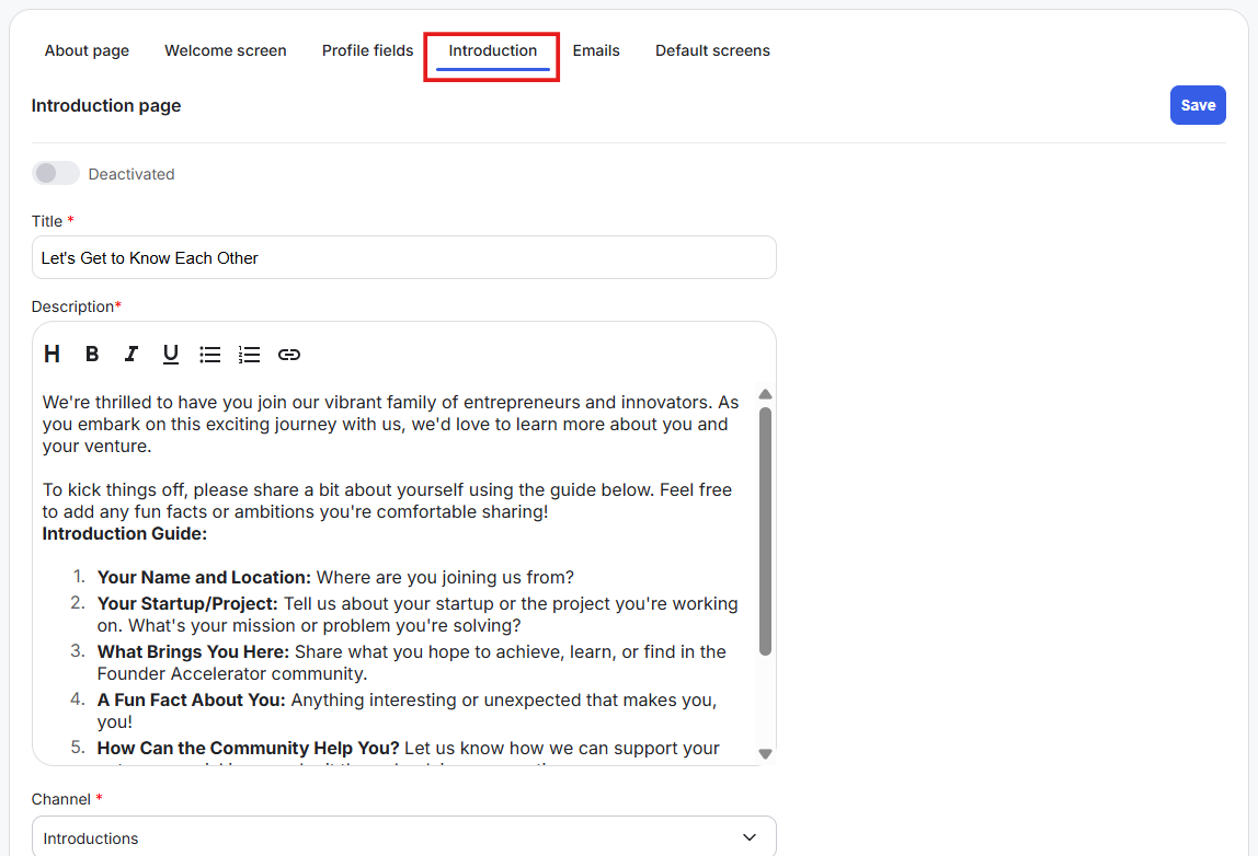 What it is: A prompt that asks new members to post an intro. Their post goes straight to your Introductions channel.