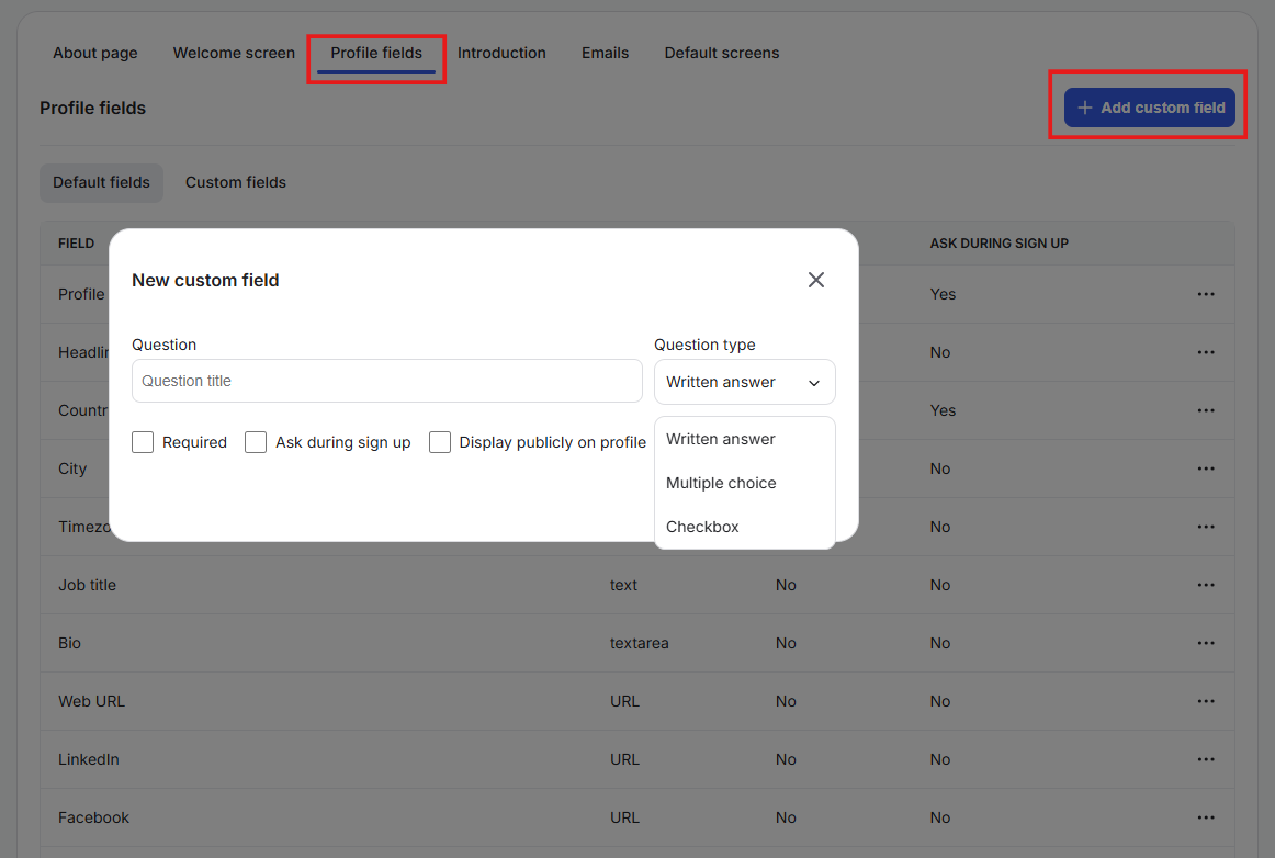 What it is: Fields members complete during onboarding. You can mark fields as required and choose which appear on profiles.