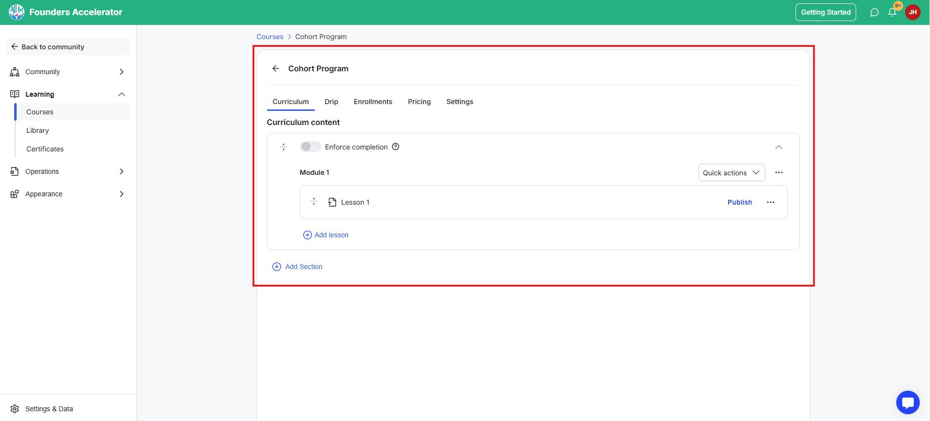 What it is: The drag-and-drop tool for creating your curriculum. Add modules/sections and different lesson types within sections that you can enforce completion on.