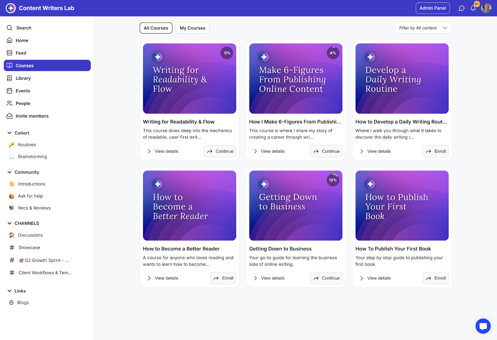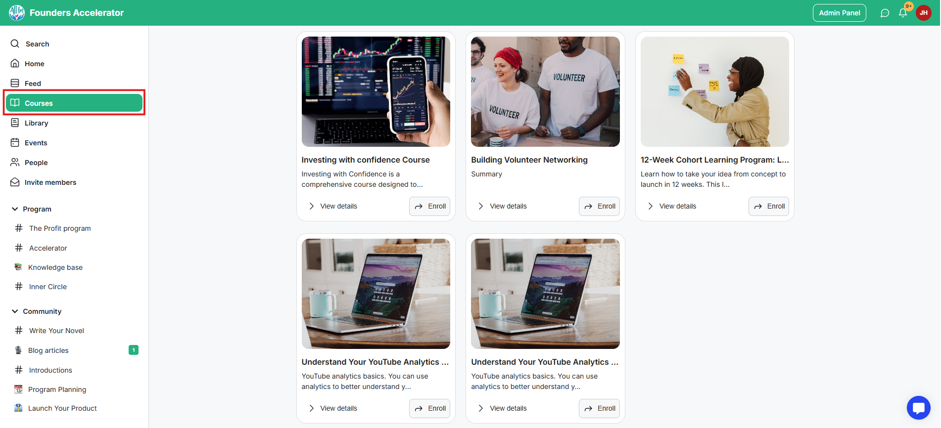 Members access all their enrolled courses through the Courses tab in your community. They can also browse other available programs, purchase new ones, or enroll directly, even if the course isn’t part of their current plan. You can sell courses as standalone products or include them within membership tiers.