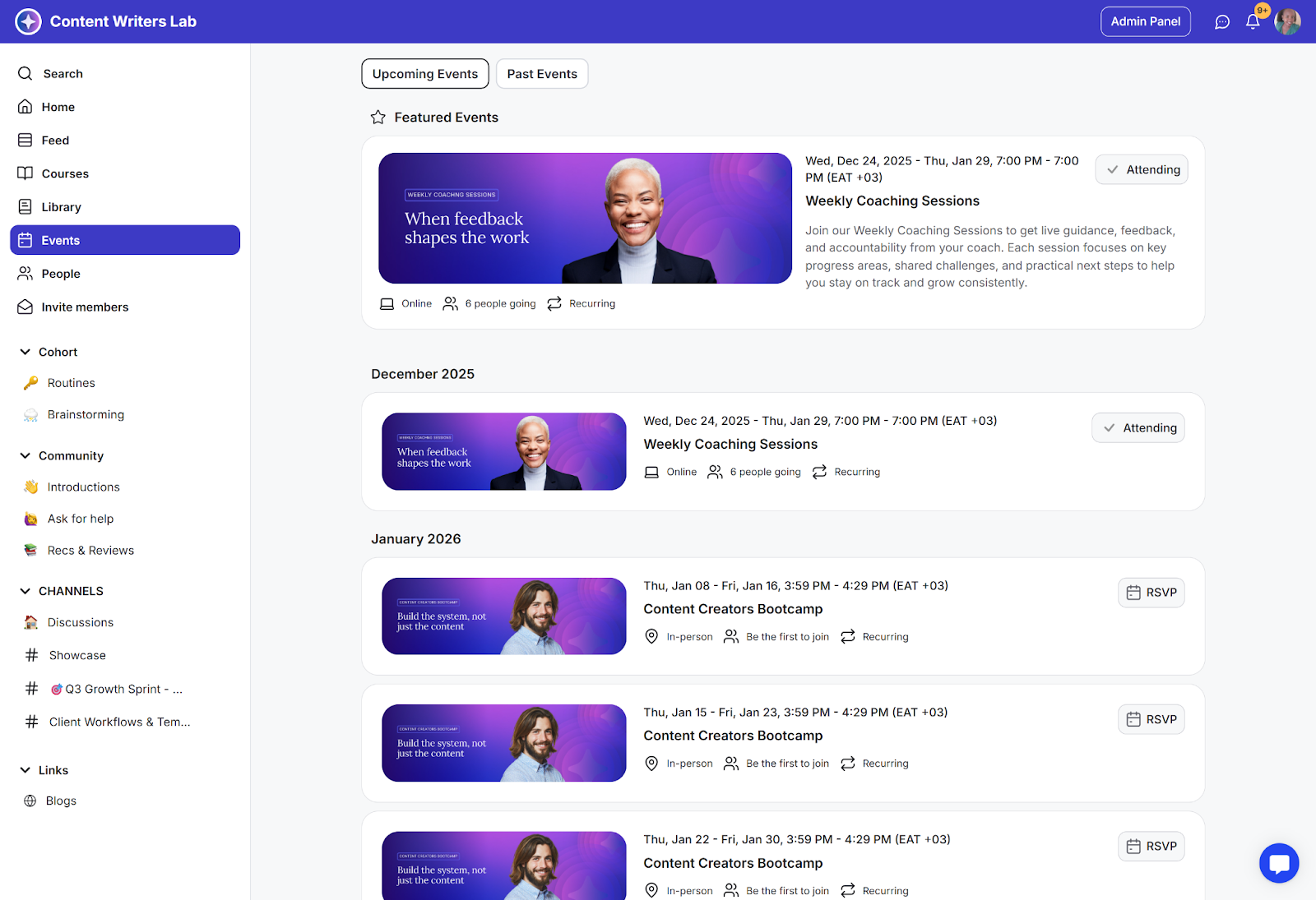 What it’s useful for: Keeps events close to the context where they matter. Cohorts see their calls in their cohort channel or course; topic-based events show up next to the related discussions or lessons.
