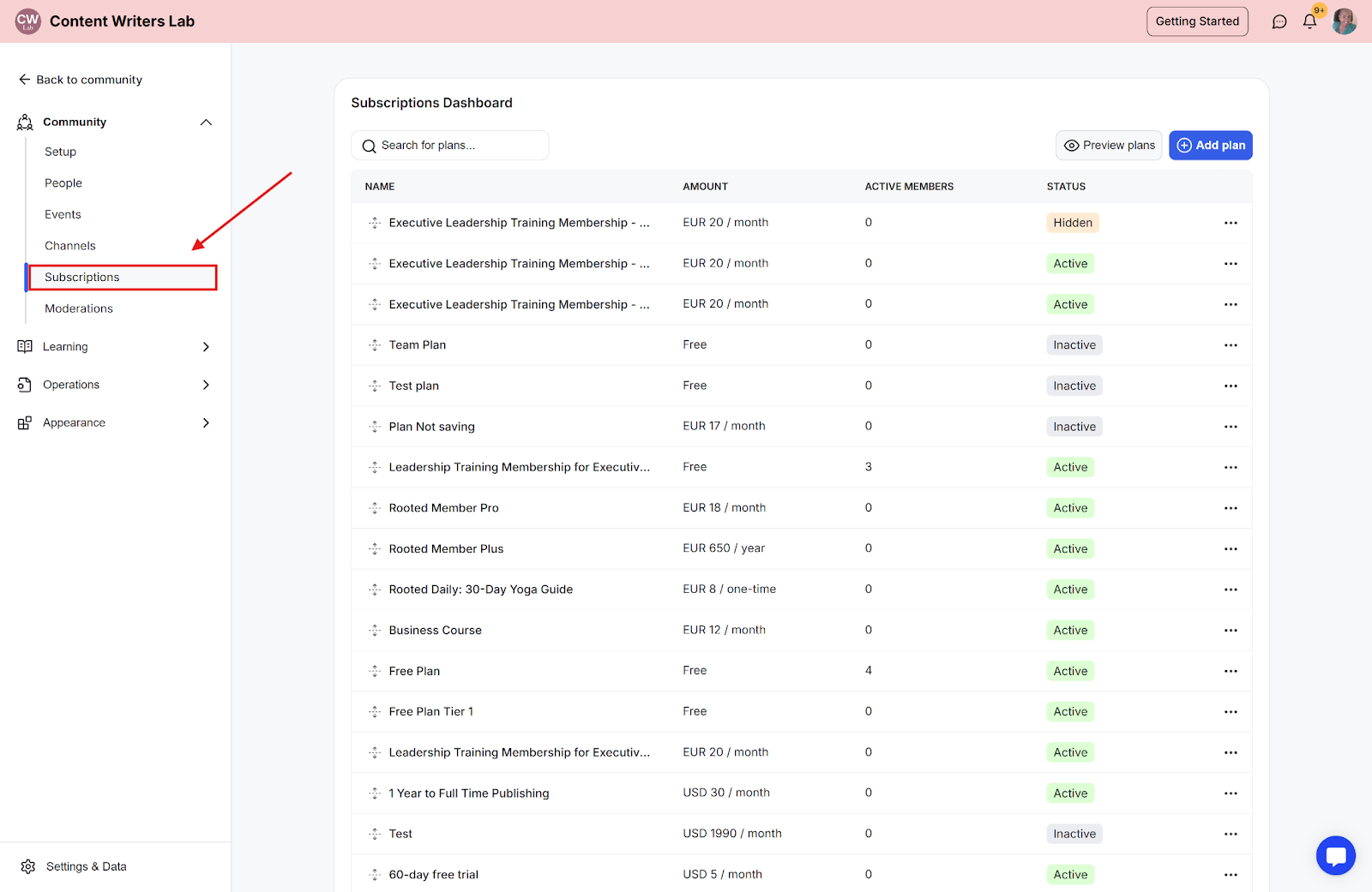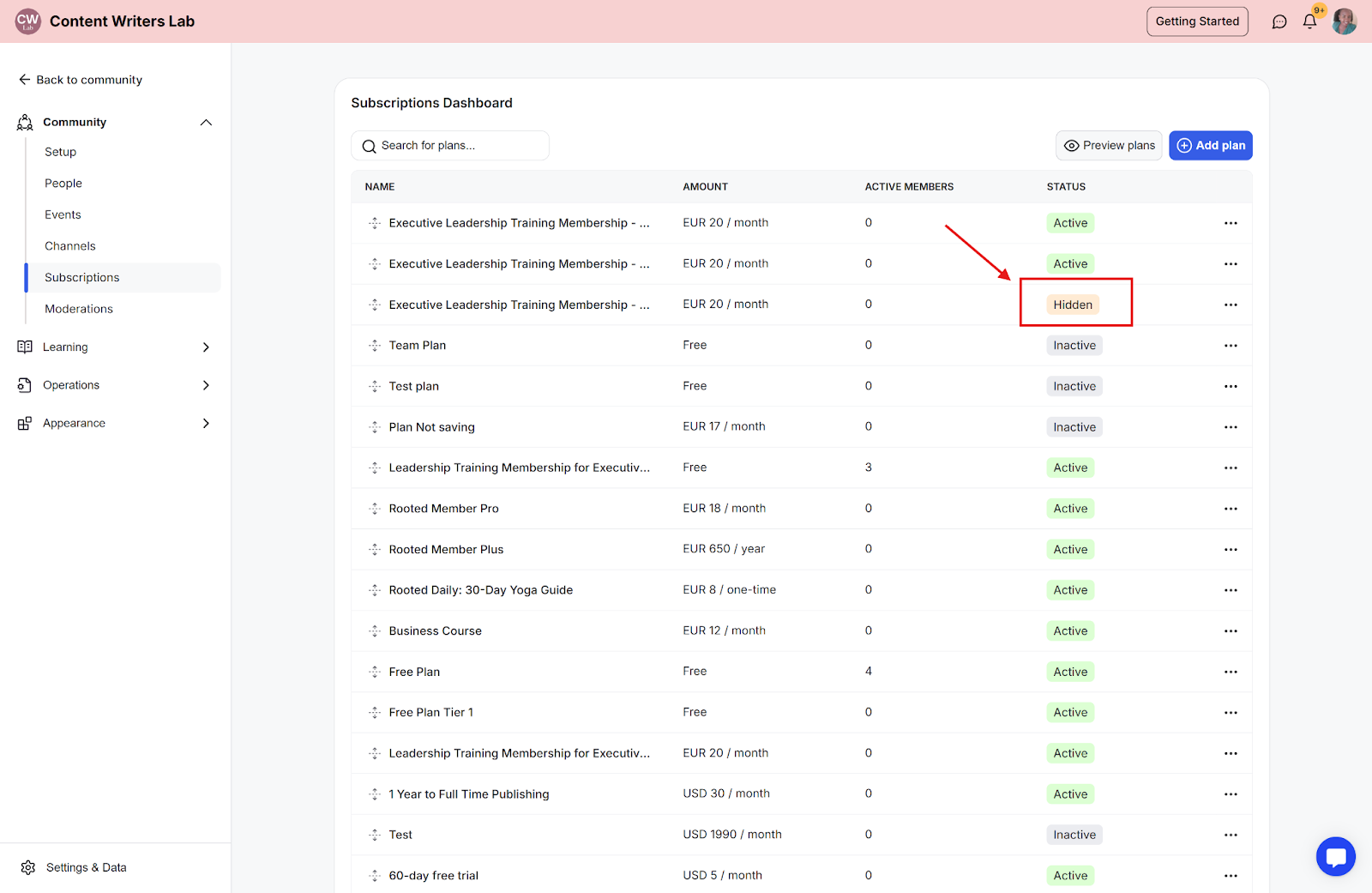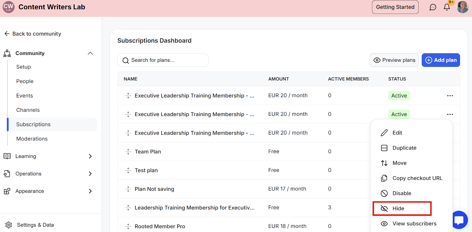 You can hide specific subscription plans and share them only with selected users. Once hidden, only members with the checkout link for that plan can sign up.