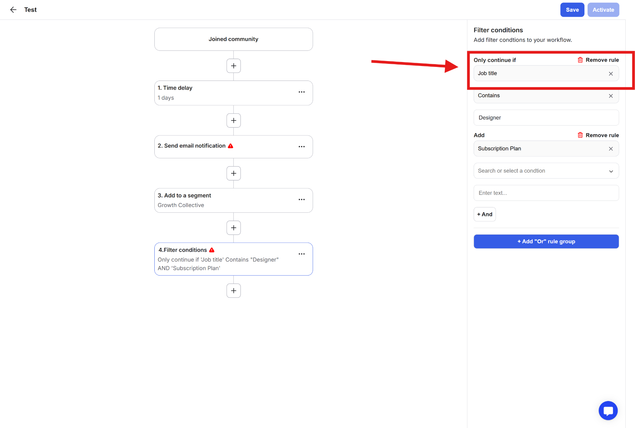 Filters control whether a workflow continues or stops based on specific conditions. They allow you to run actions only for members who meet certain criteria.