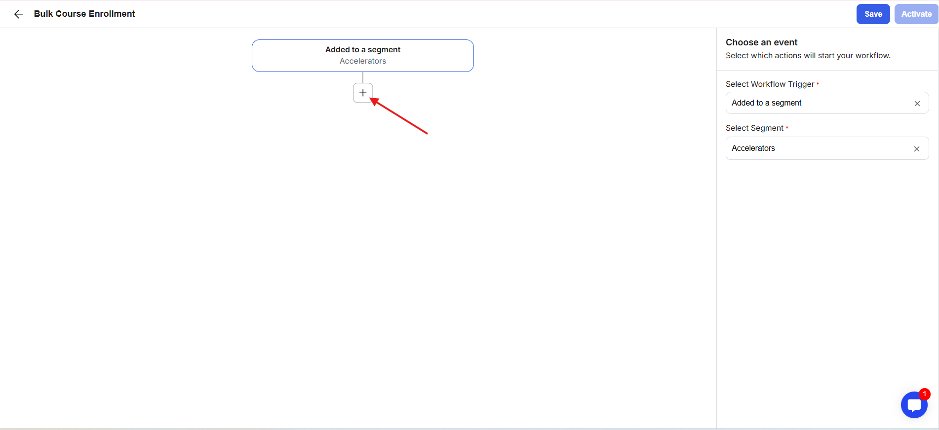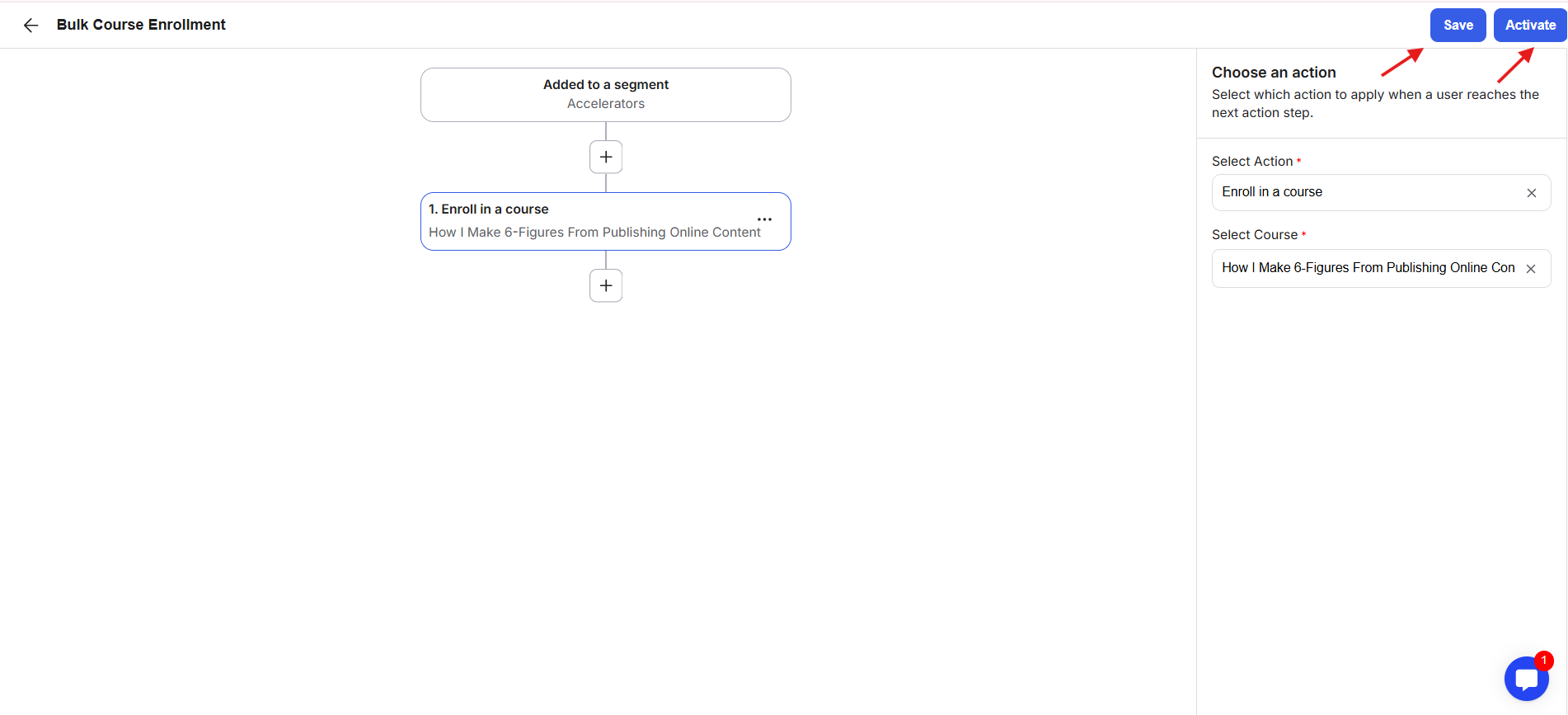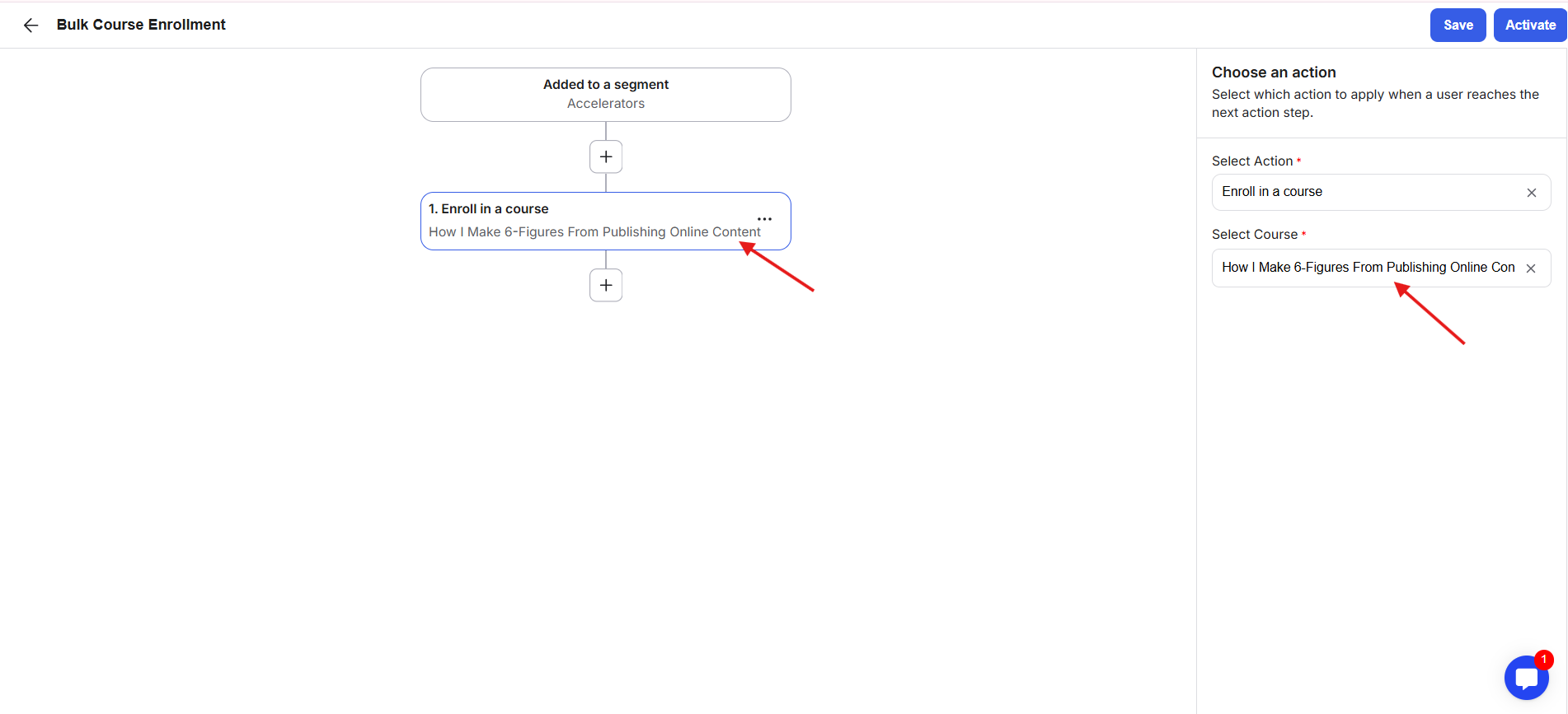 12) Click on Action. Then, in the right-side panel, click on the Select Action drop-down and choose the action you want to perform. For this example, select Enroll to a course, and then choose the course from the drop-down field. Once specified, the name in the second step box updates automatically.