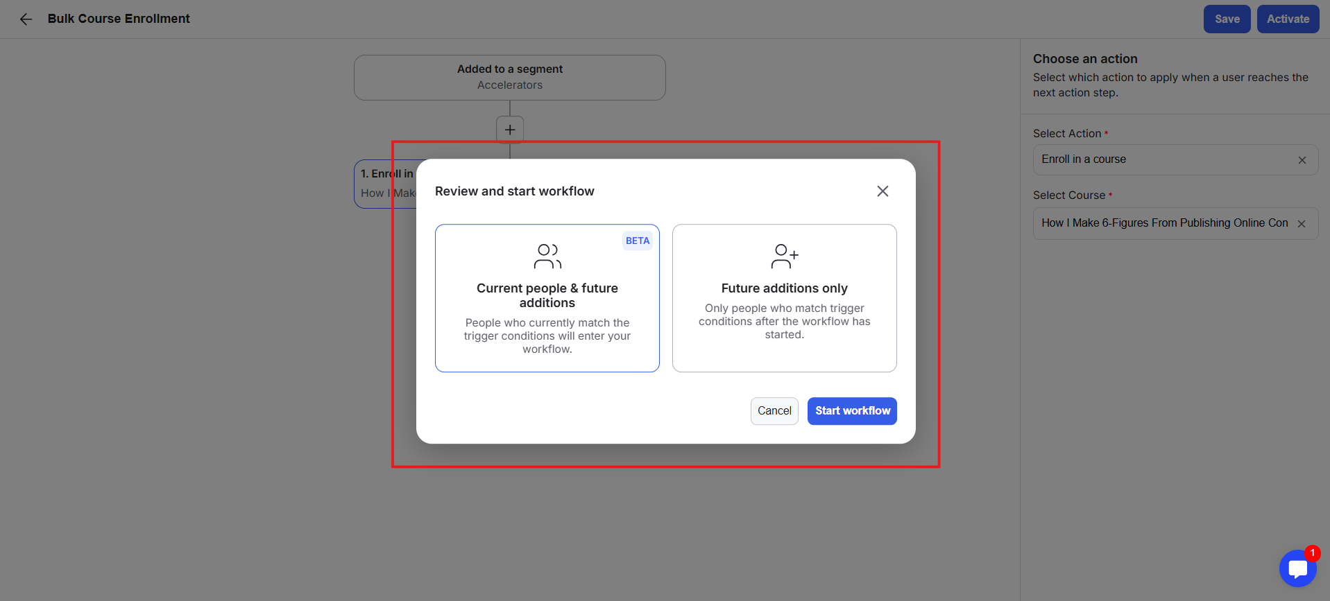 20) If you choose Future additions only, only members who are added to the specified segment after the workflow is activated will be enrolled in the selected course.