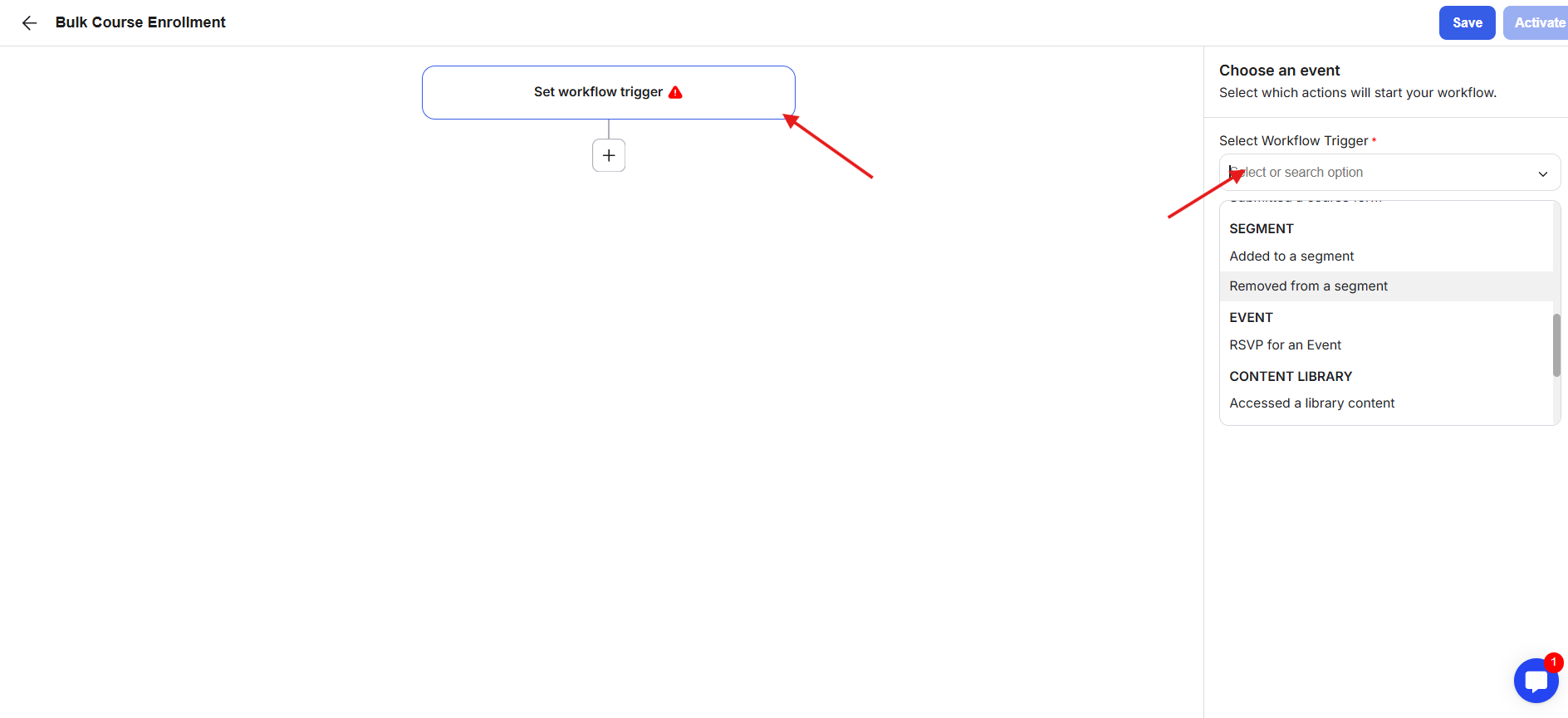 8) From the right-side panel, choose a trigger by clicking on the Select Workflow Trigger drop-down. This trigger is the action that will start the workflow.