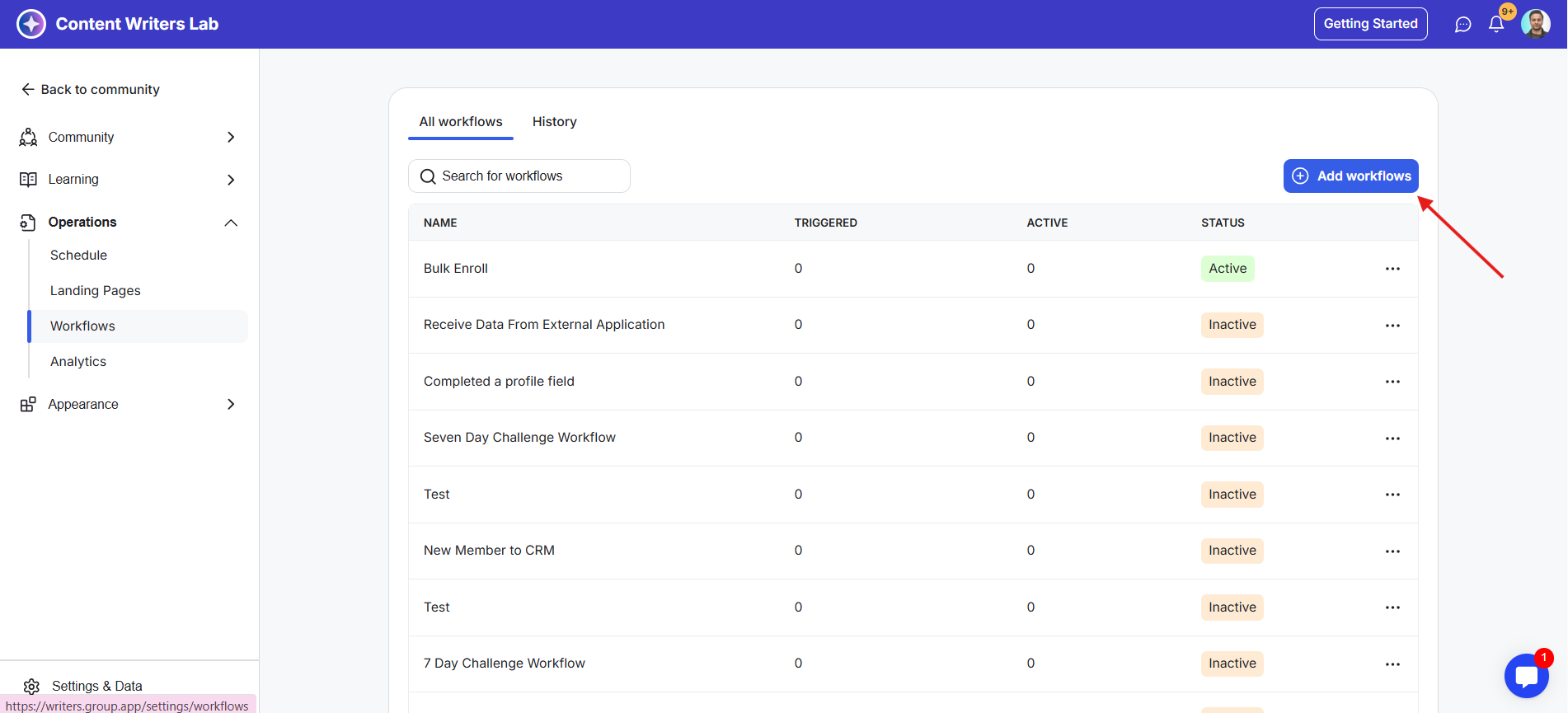2) Click on the Operations tab on the left-side menu, then click on Workflows from the Operations drop-down menu. This opens the Workflows Dashboard.