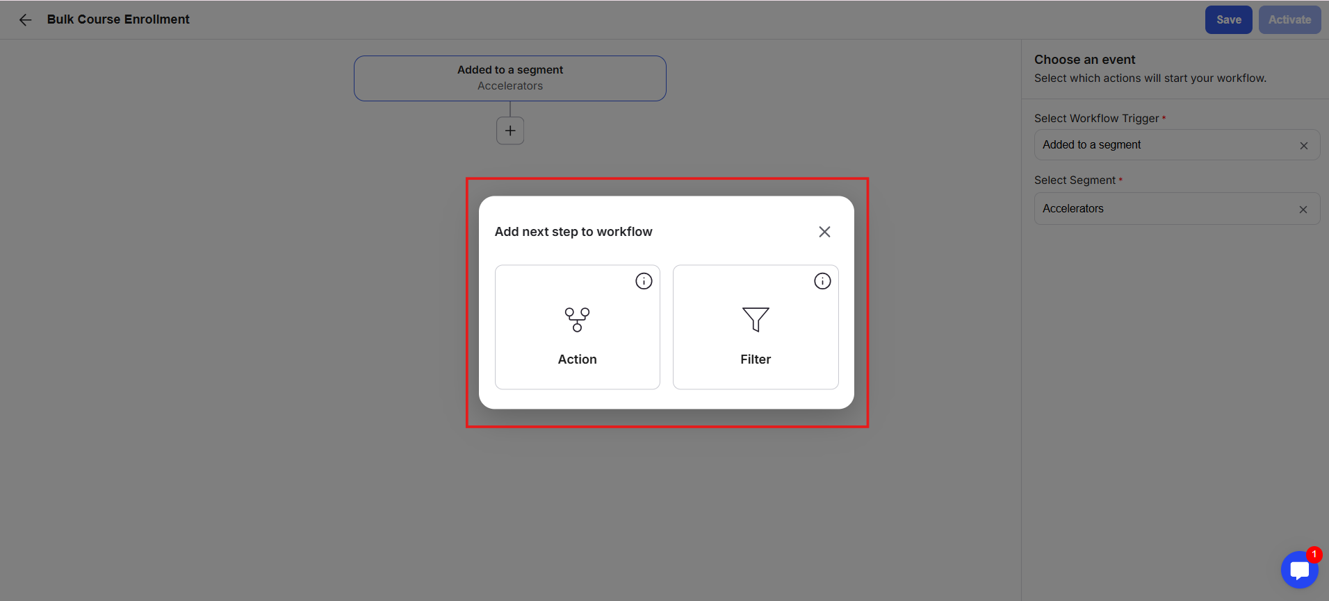11) A pop-up appears where you can choose either Action (the task the workflow will perform) or Filter (conditions that must be met for the workflow to continue).