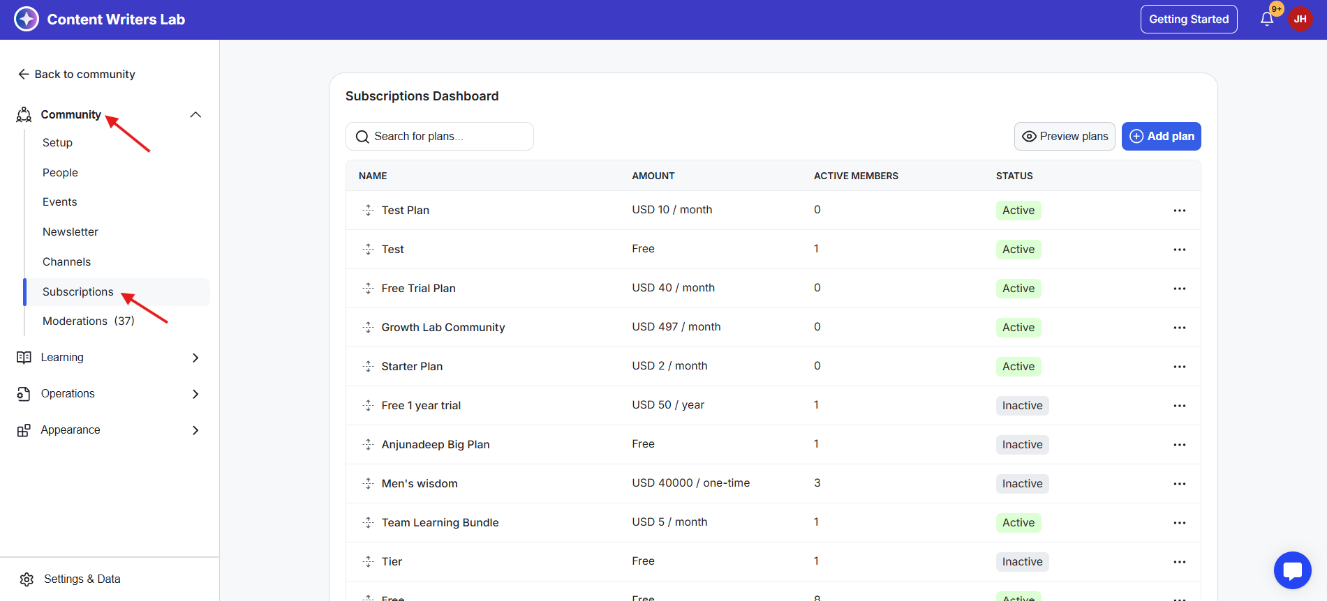 3) From the left-side menu, open the Community dropdown, then click Subscriptions. This will take you to the Subscriptions dashboard, where all your existing plans are listed.