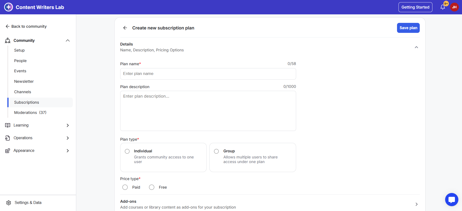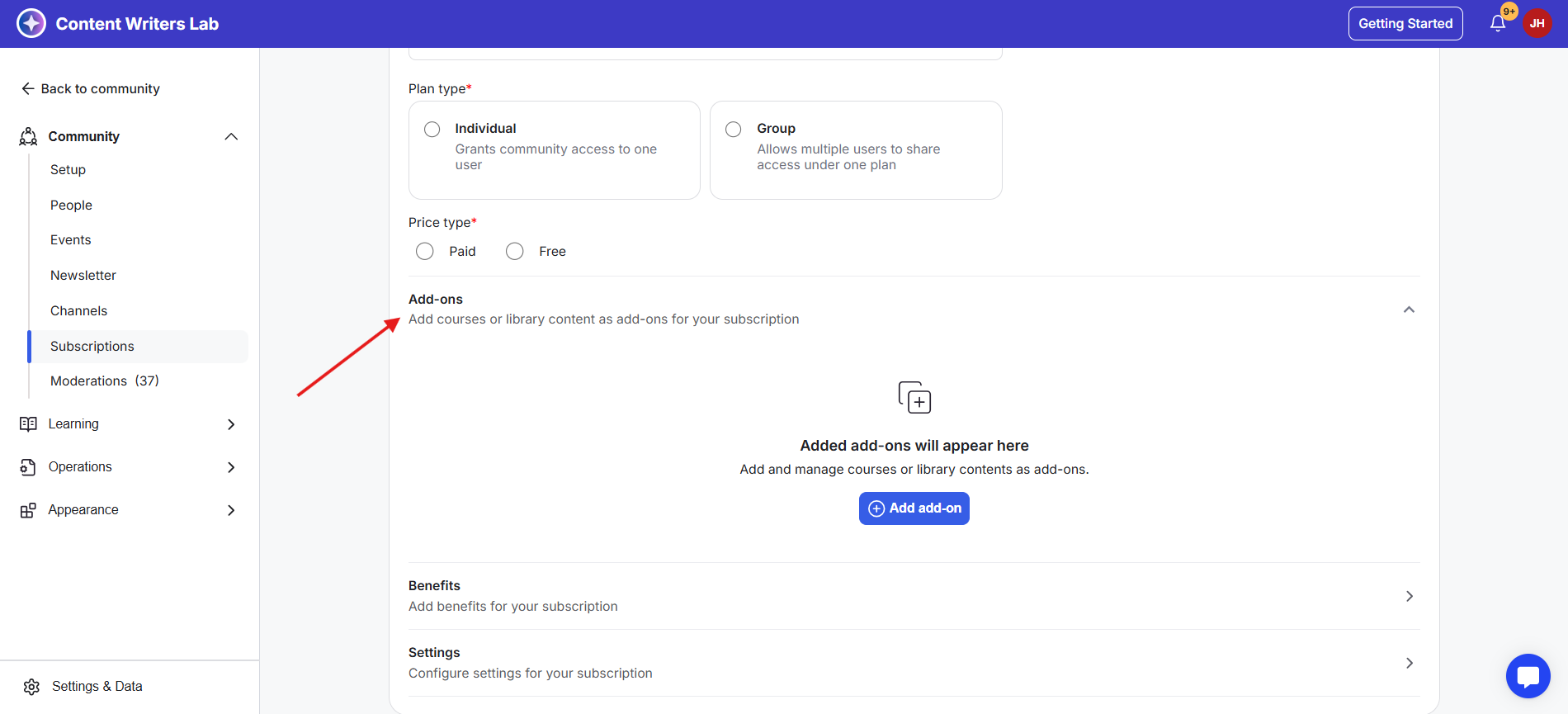 1) Add-ons can be created from either a Subscription Plan or the Pricing section of a Course or Library Resource. In this example, we’ll walk through creating add-ons using a subscription plan.