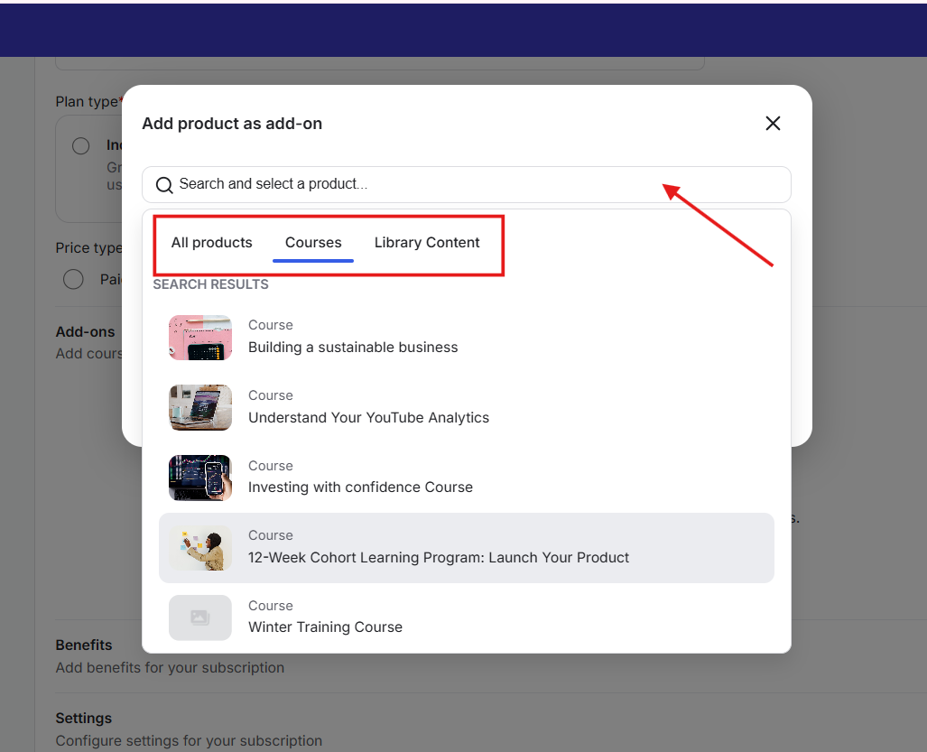 11) This opens a pop-up where you can search and select products to attach as add-ons. You’ll also see tabs for Courses and Library Content to help you filter your search.