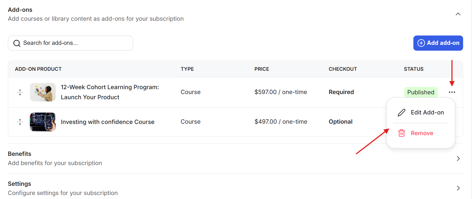 To update or remove an existing add-on, you need to access the product where it was created.