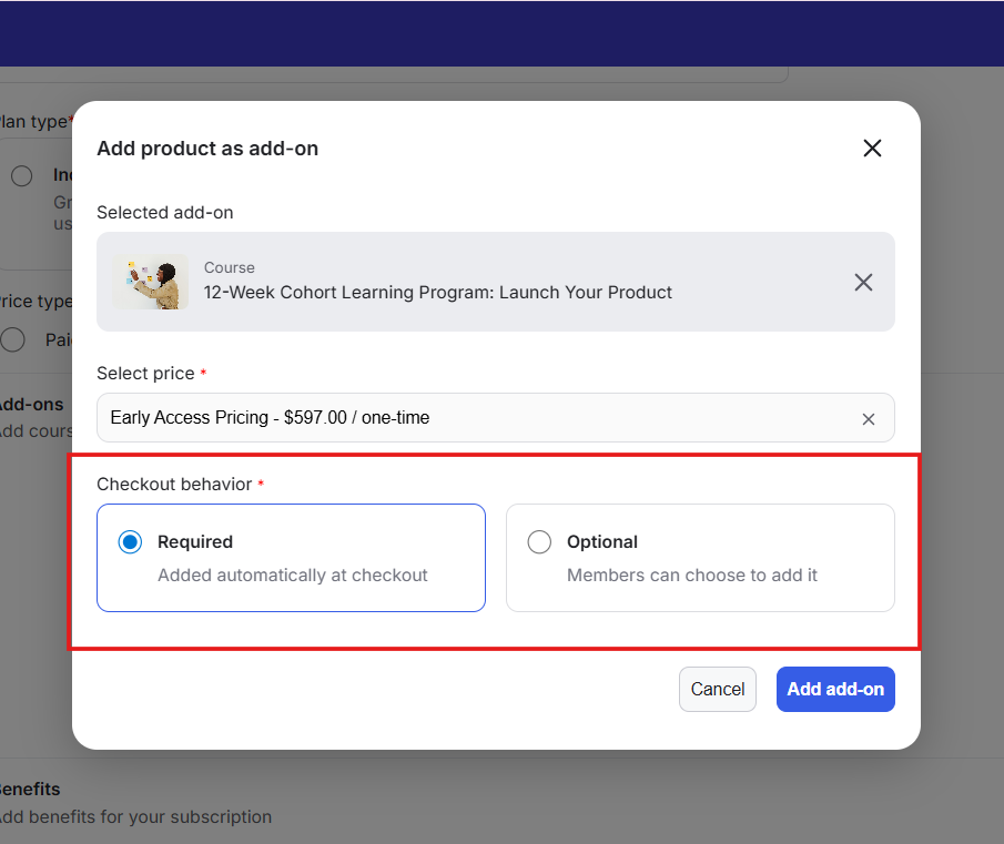 When configuring an add-on, you can choose how it behaves during checkout. An optional add-on works like an upsell and can be selected by the member. A required add-on is automatically included and must be purchased to complete checkout