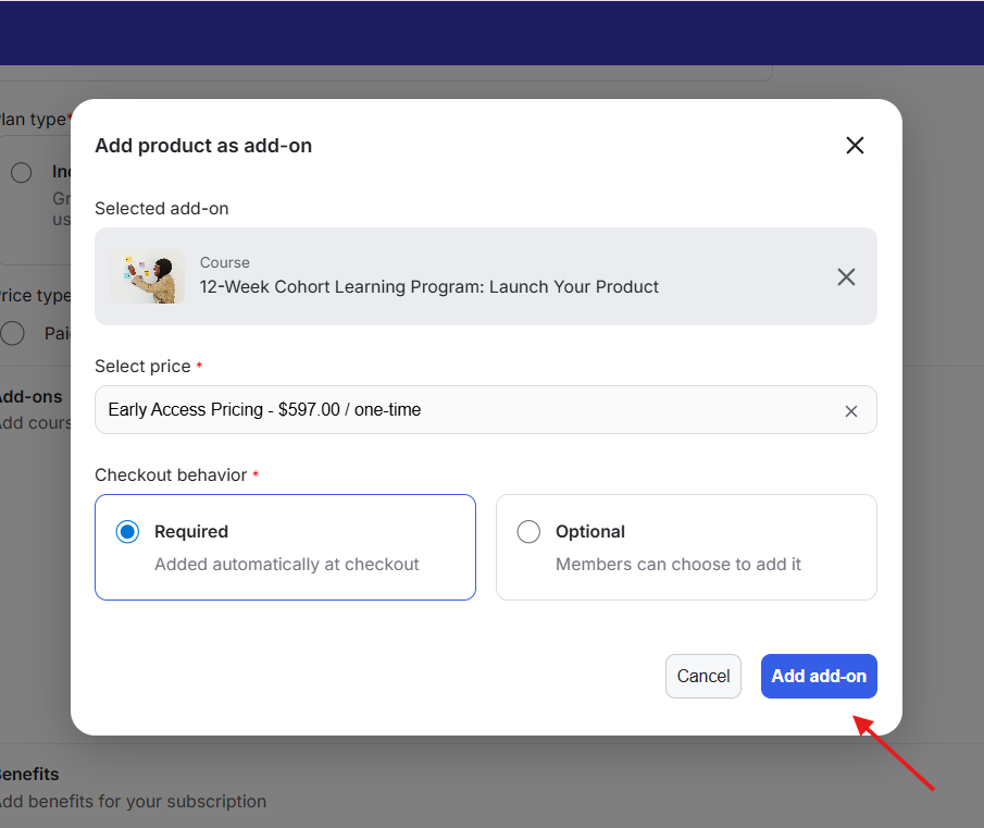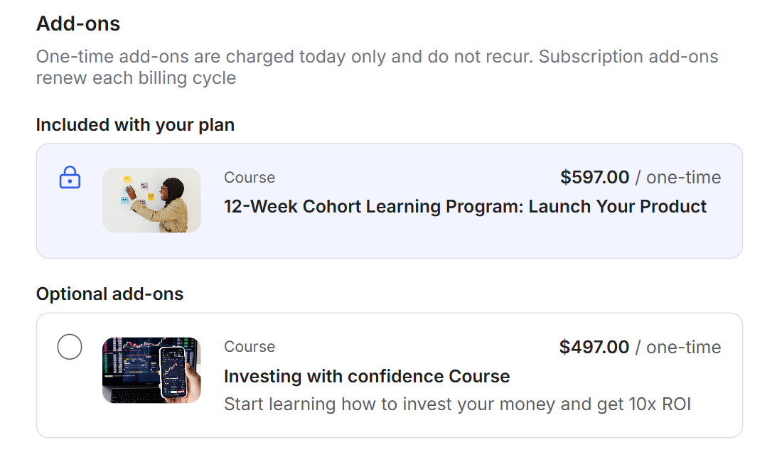 Add-ons let you offer additional products during checkout. They appear directly on the checkout page, giving members the option to include extra items before completing their purchase. The Add-ons feature is available on the Scale and Organization Plan.