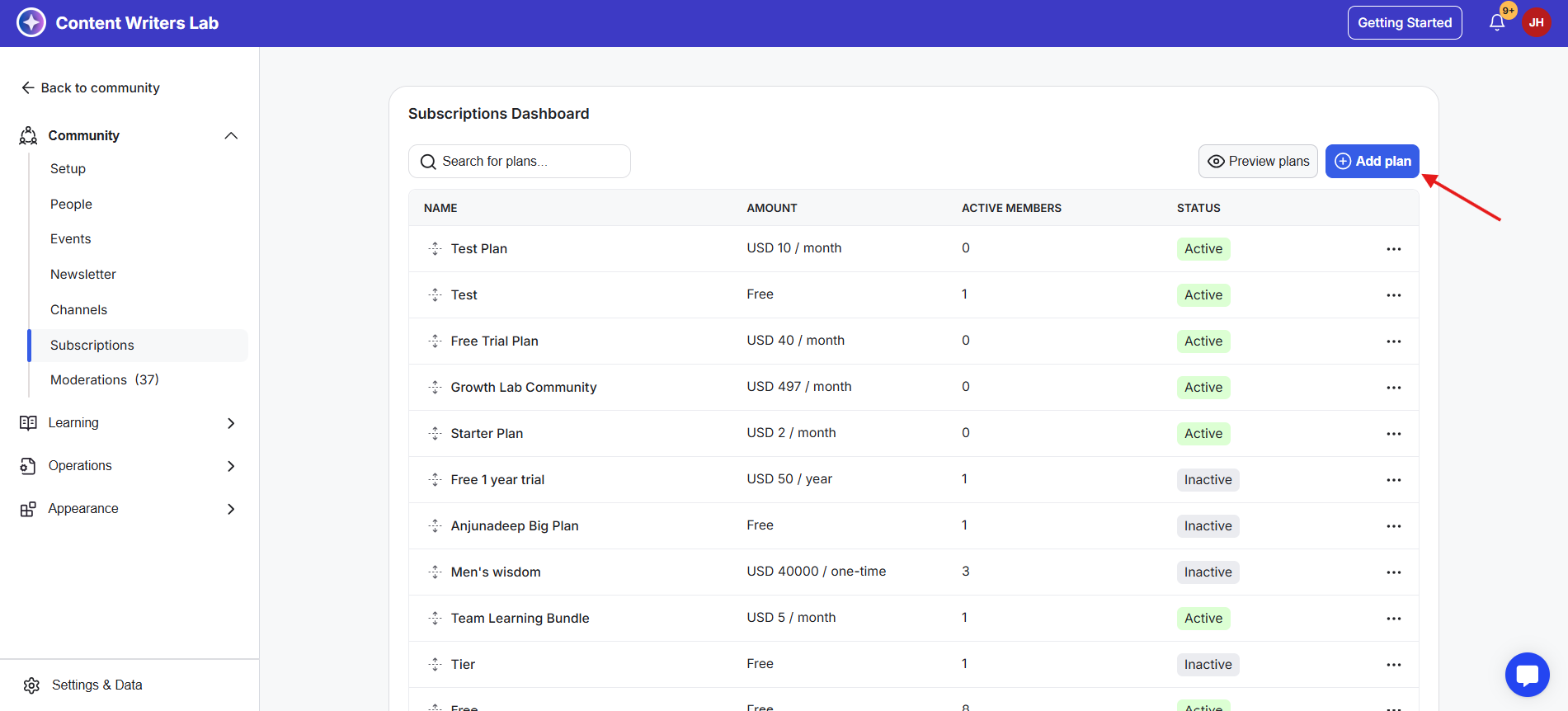 6) To create a new plan, click the + Add Plan button in the top-right corner. This opens the Subscription Builder.