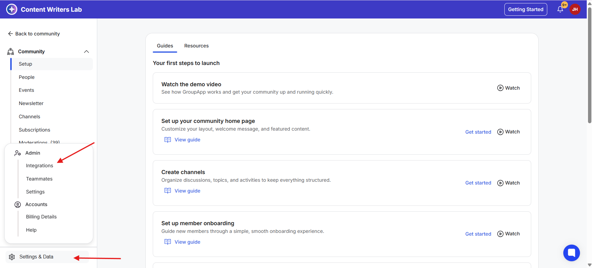 3) Select Integrations from the pop-up menu. This opens the Integrations Dashboard.