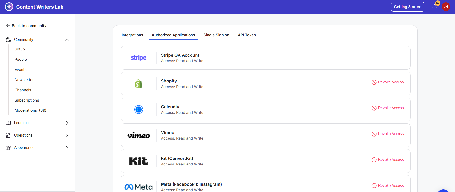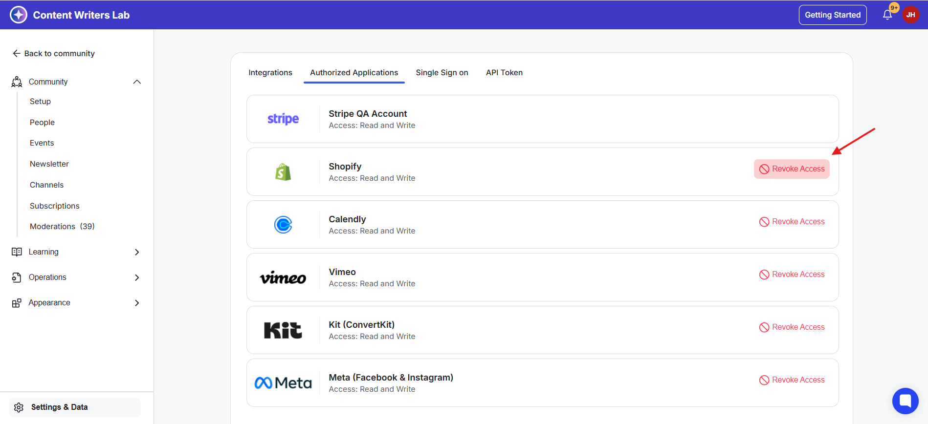 5) Find the tool you want to remove. Click Revoke Access. Once revoked, the integration is removed and will no longer have access to your community.