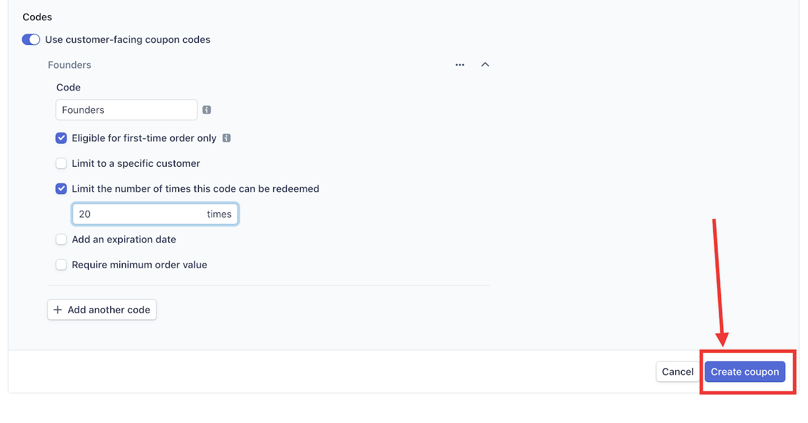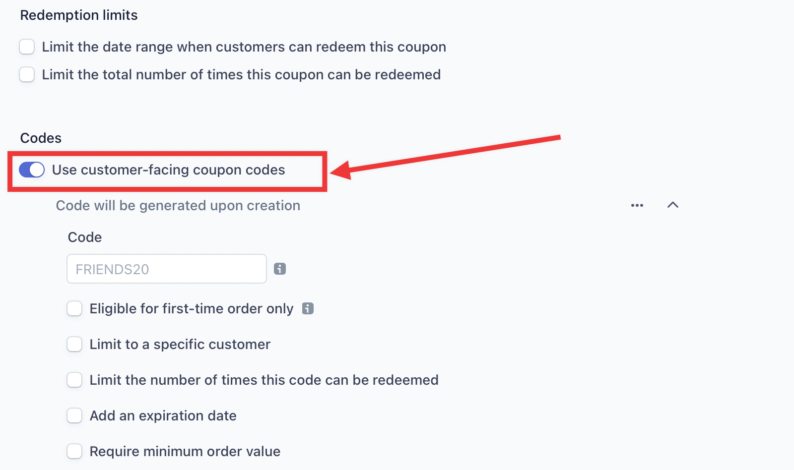 Step 7: Set up a customer-facing code by entering a customer-friendly coupon name and selecting any other requirements you would like for the coupon code.