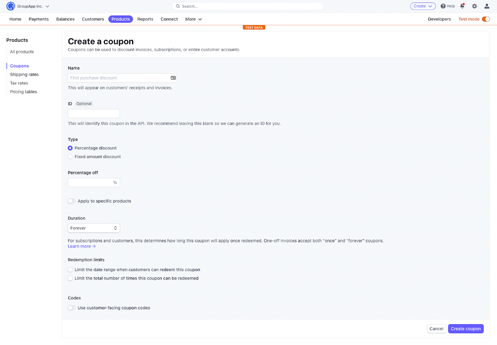 Step 5: You will now be redirected to the coupon creation process in Stripe. There, you will be able to set an internal coupon name and discount type, apply the coupon to a membership product, set coupon duration, and set redemption limits.