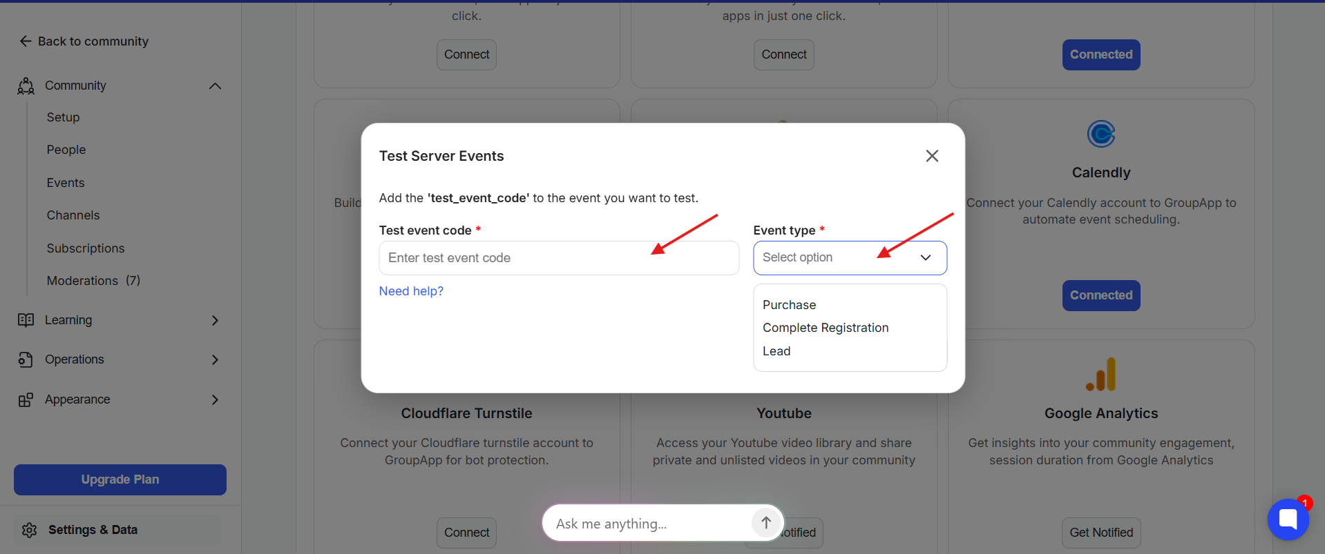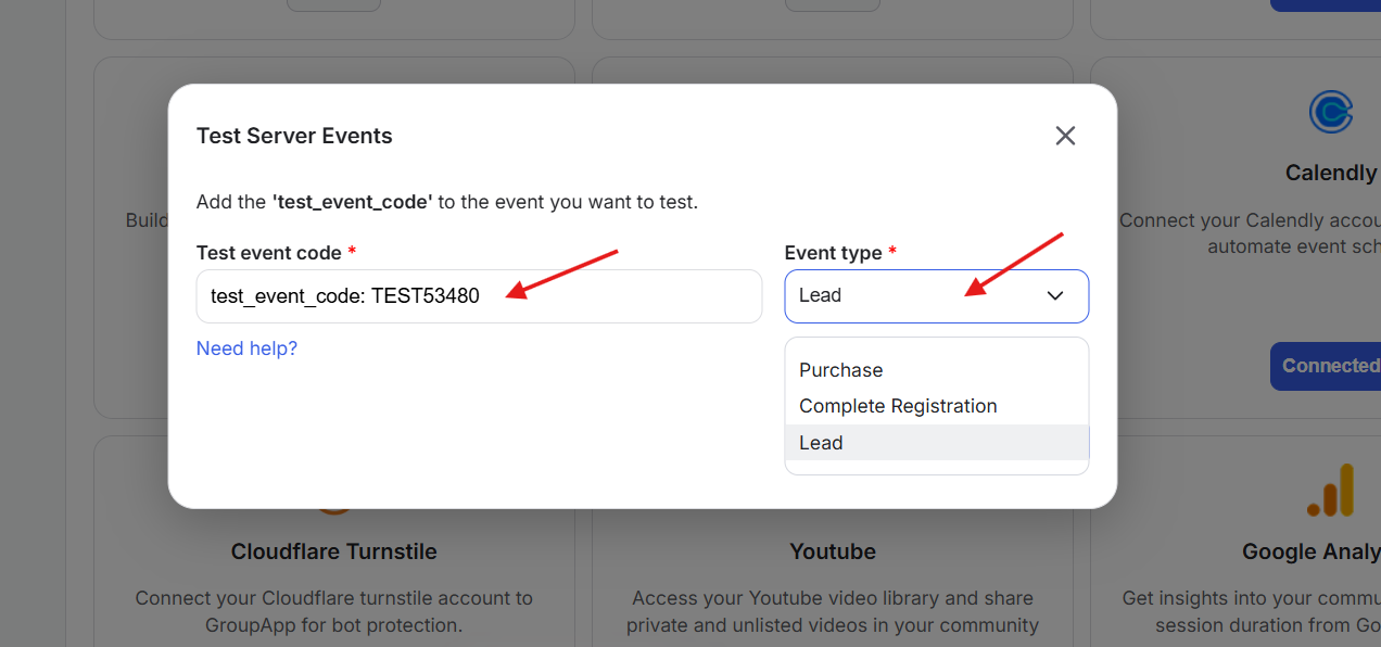 5) Come back to your Integrations Dashboard in GroupApp. Paste the code to field and specify the event type. For this example, we choose the lead option as event type. Once