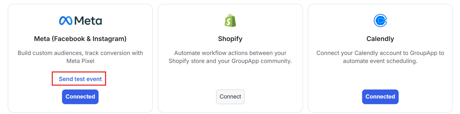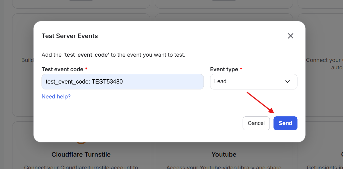 1) Once the integration is established, you’ll see the option “Send Test Event” on the Meta (Facebook & Instagram) card.