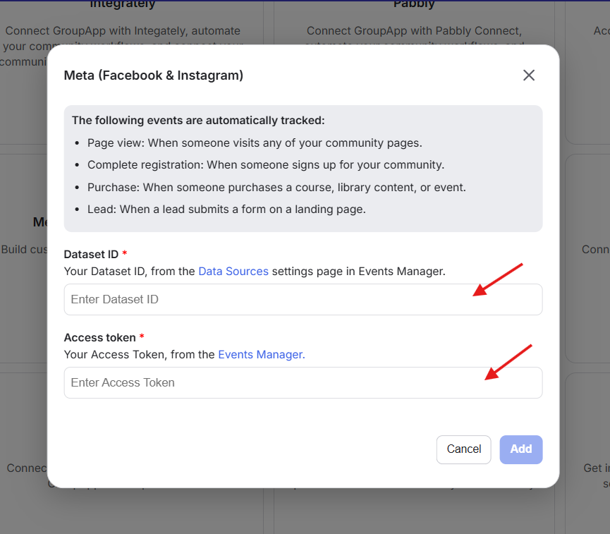 2) Access Token: This is a secure token generated in Meta Events Manager. It allows GroupApp to send event data to your Meta account.