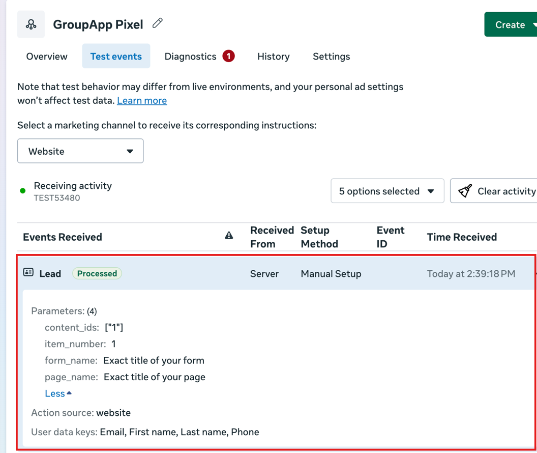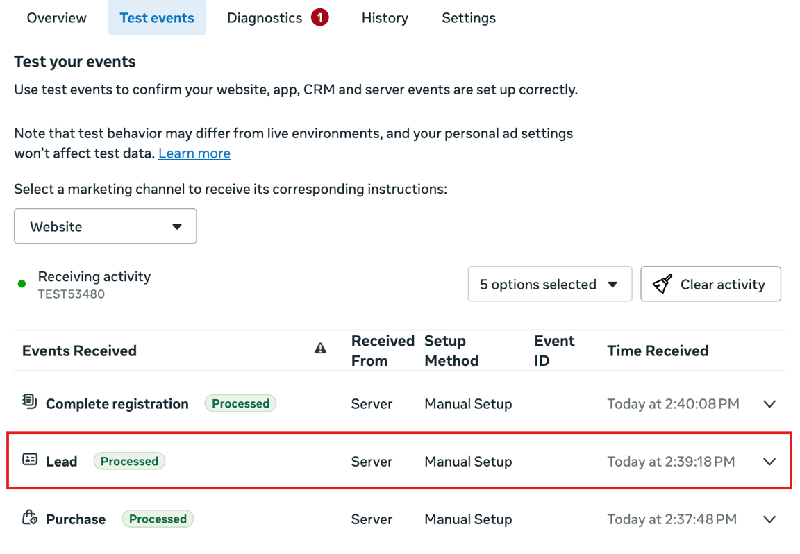 7) Go back to your Meta Account and the test event will be reflected there either as lead, completed registration, or purchase.