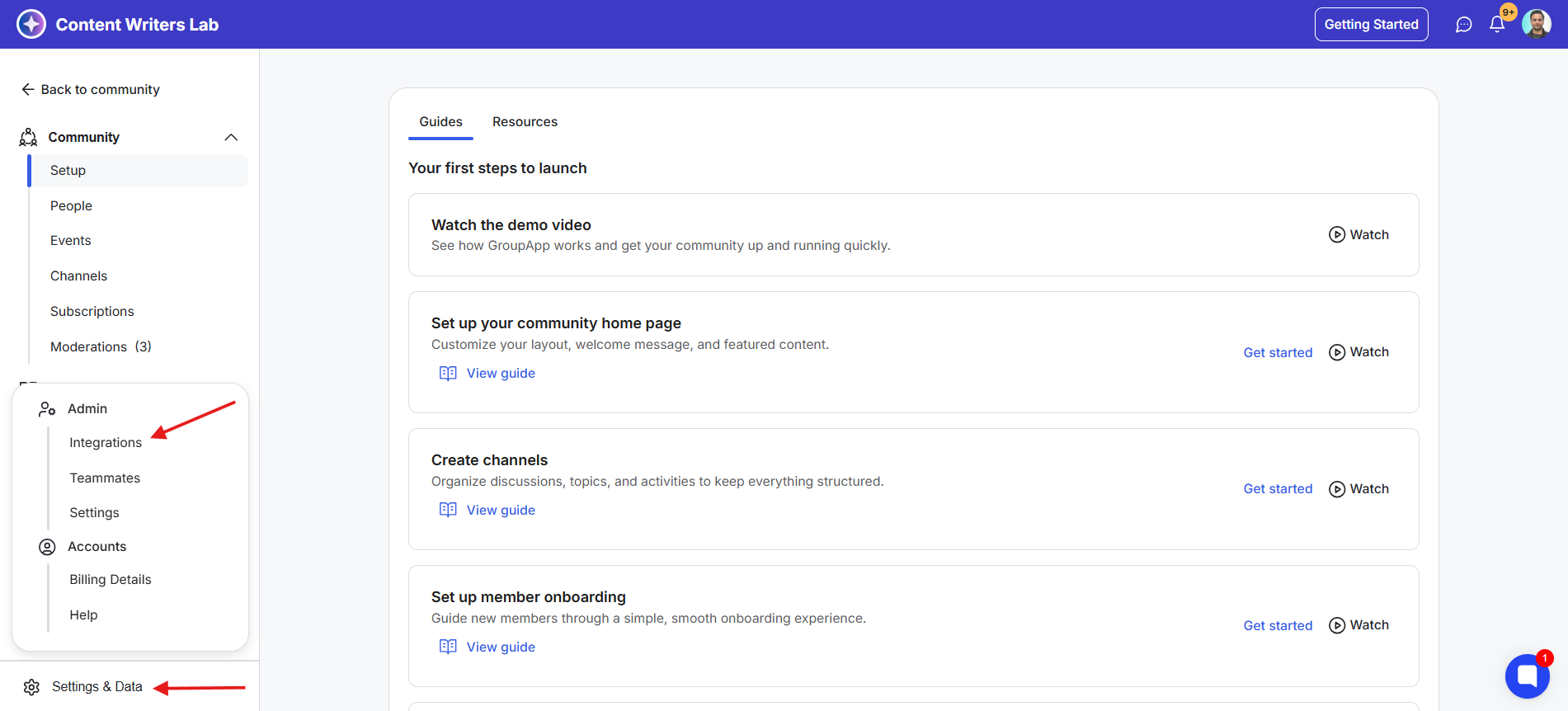 2) Click on the Settings & Data option on the bottom-left and then select Integrations.