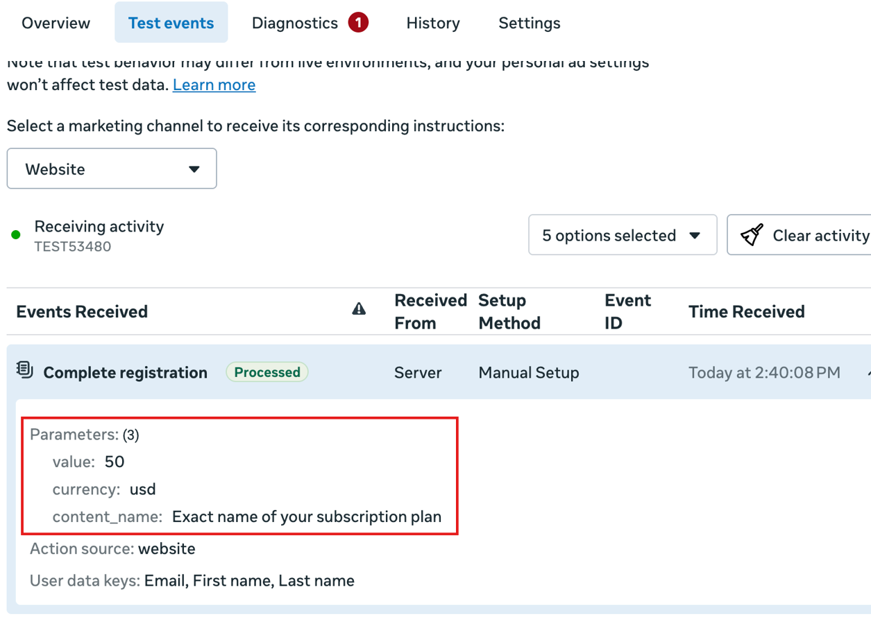 9) If the event is a Complete Registration or Purchase, GroupApp also sends the associated value to Meta (as shown below). This helps you understand not just that an action happened, but what it was worth, giving you a clearer view of your campaign performance and return on ad spend.