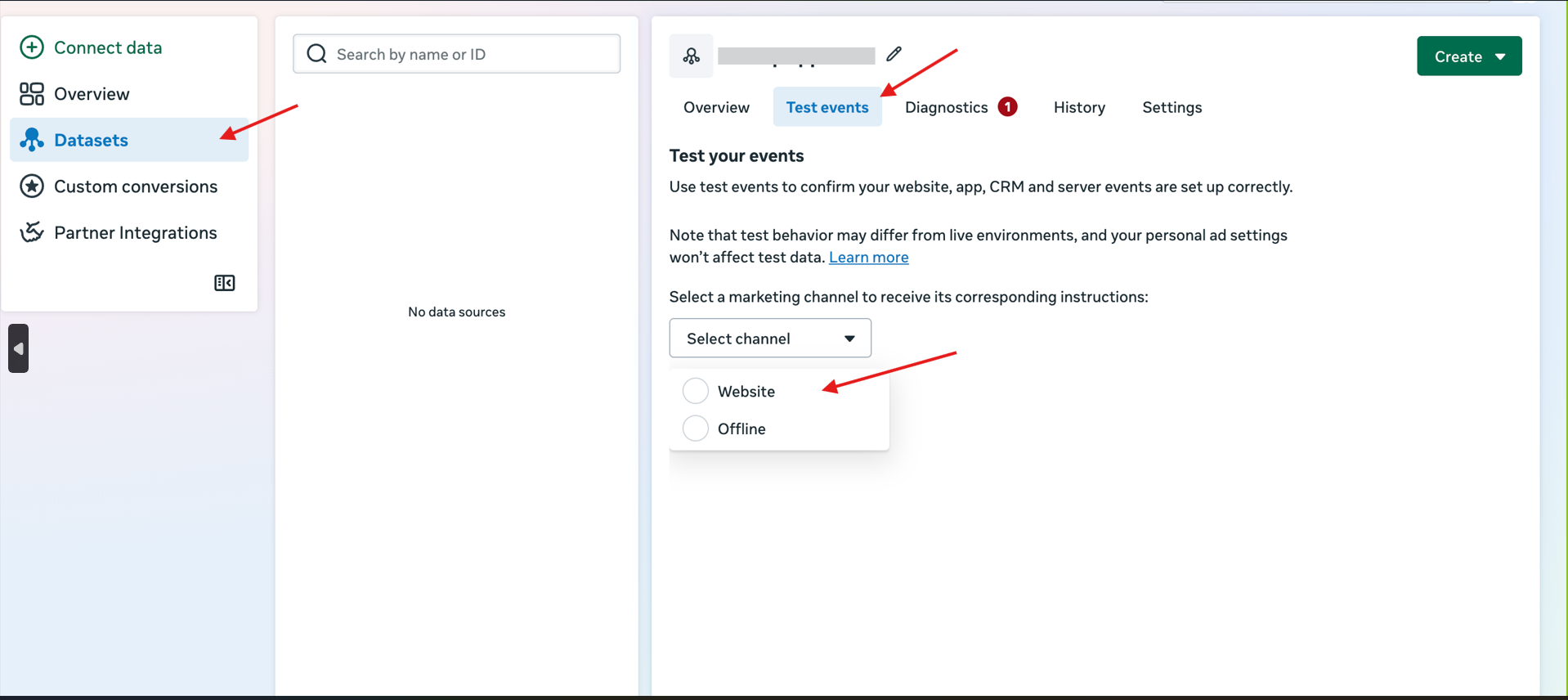 3) Now go to your Meta Account and click on the Datasets Tab on the left-side. This opens a dashboard. Find the Test Events Tab on the right side panel. Click on the tab and further specify the channel to “Website” from the drop-down.
