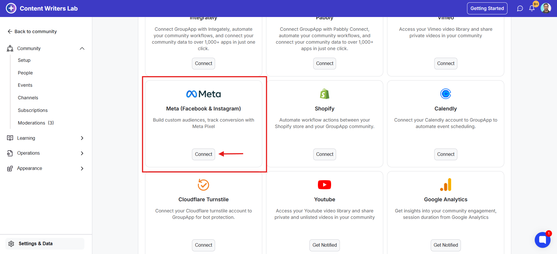 3) Find Meta (Facebook & Instagram) and click Connect.