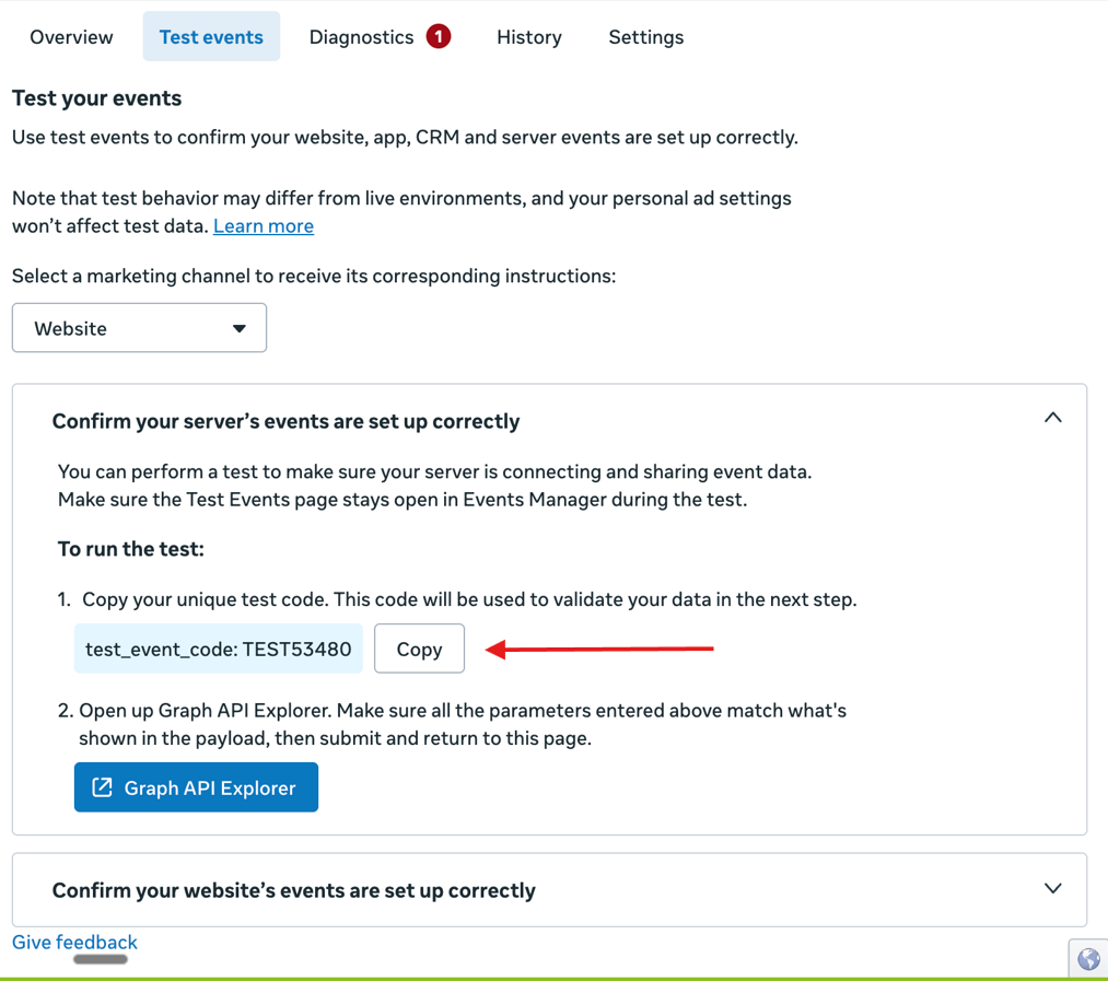 4) When specified to website, a test section appears on the panel (as shown below). Copy the unique Test Event Code.