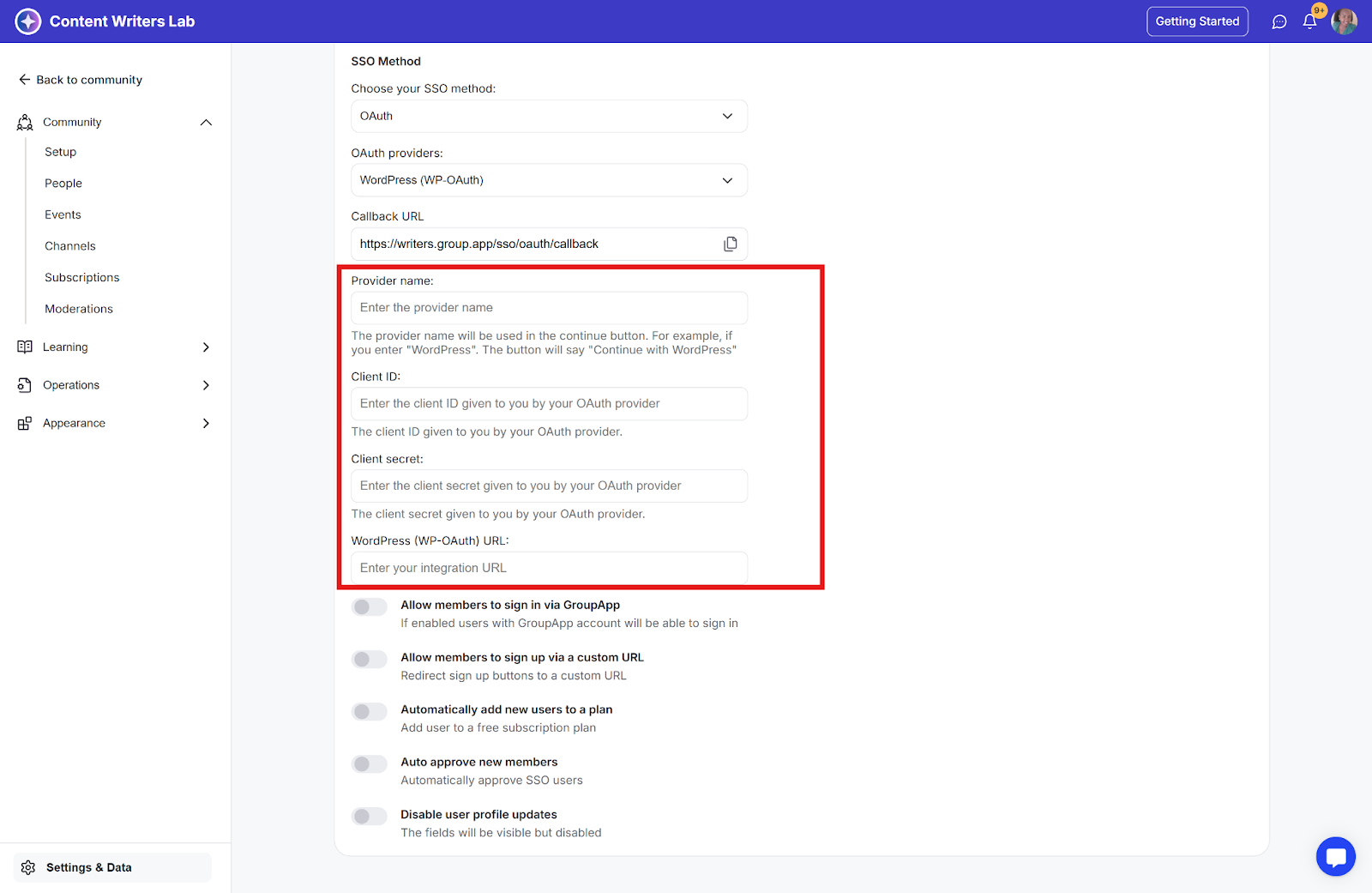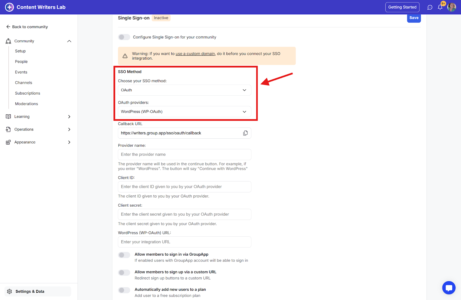 Step 8: On the Single Sign-on page, under SSO Method select OAuth as the single Single-on method and then select WordPress (WP-OAuth) as the OAuth provider.